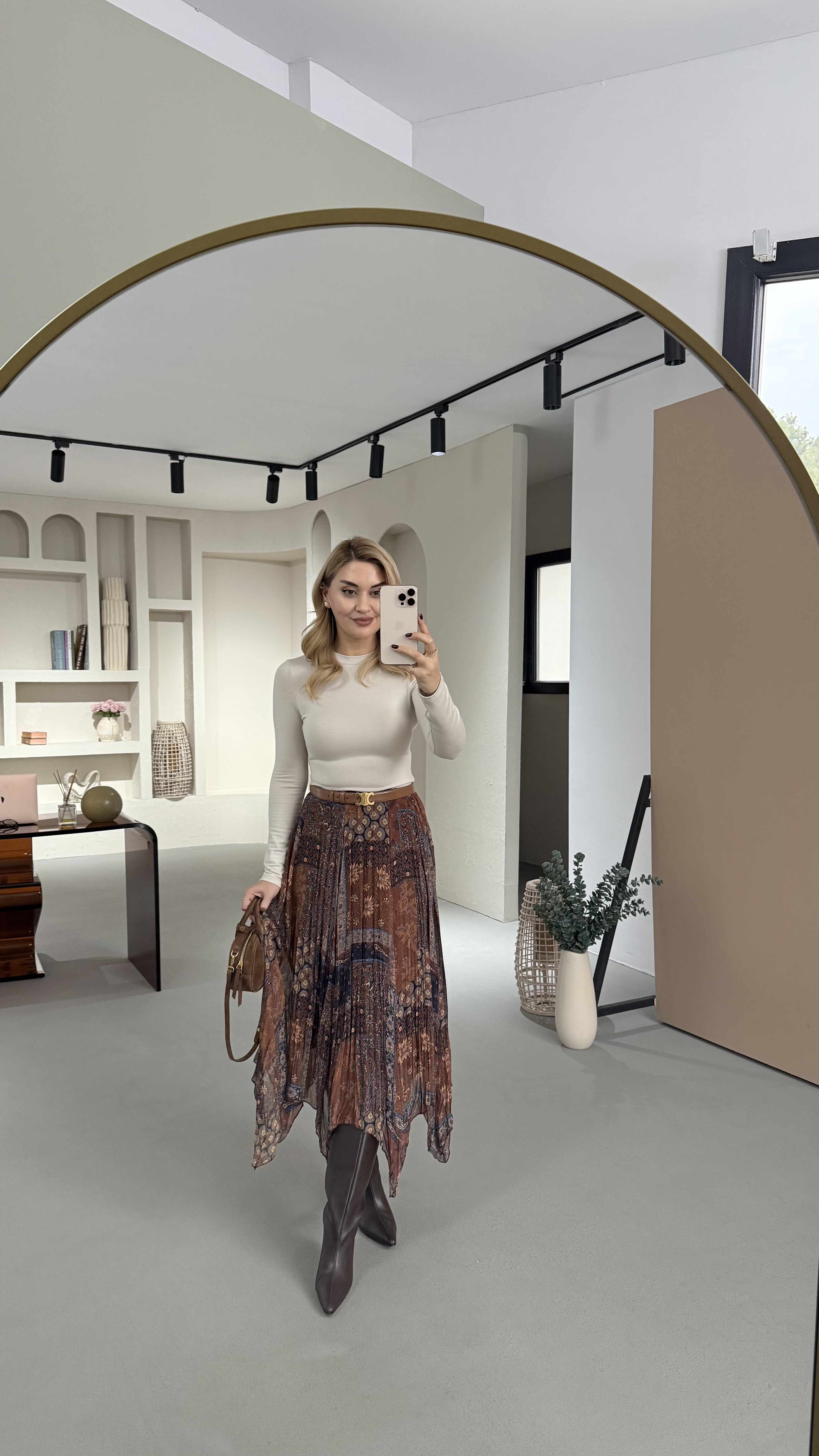 Taba Lacivert Desen Beli Lastikli Asimetrik Şifon Etek