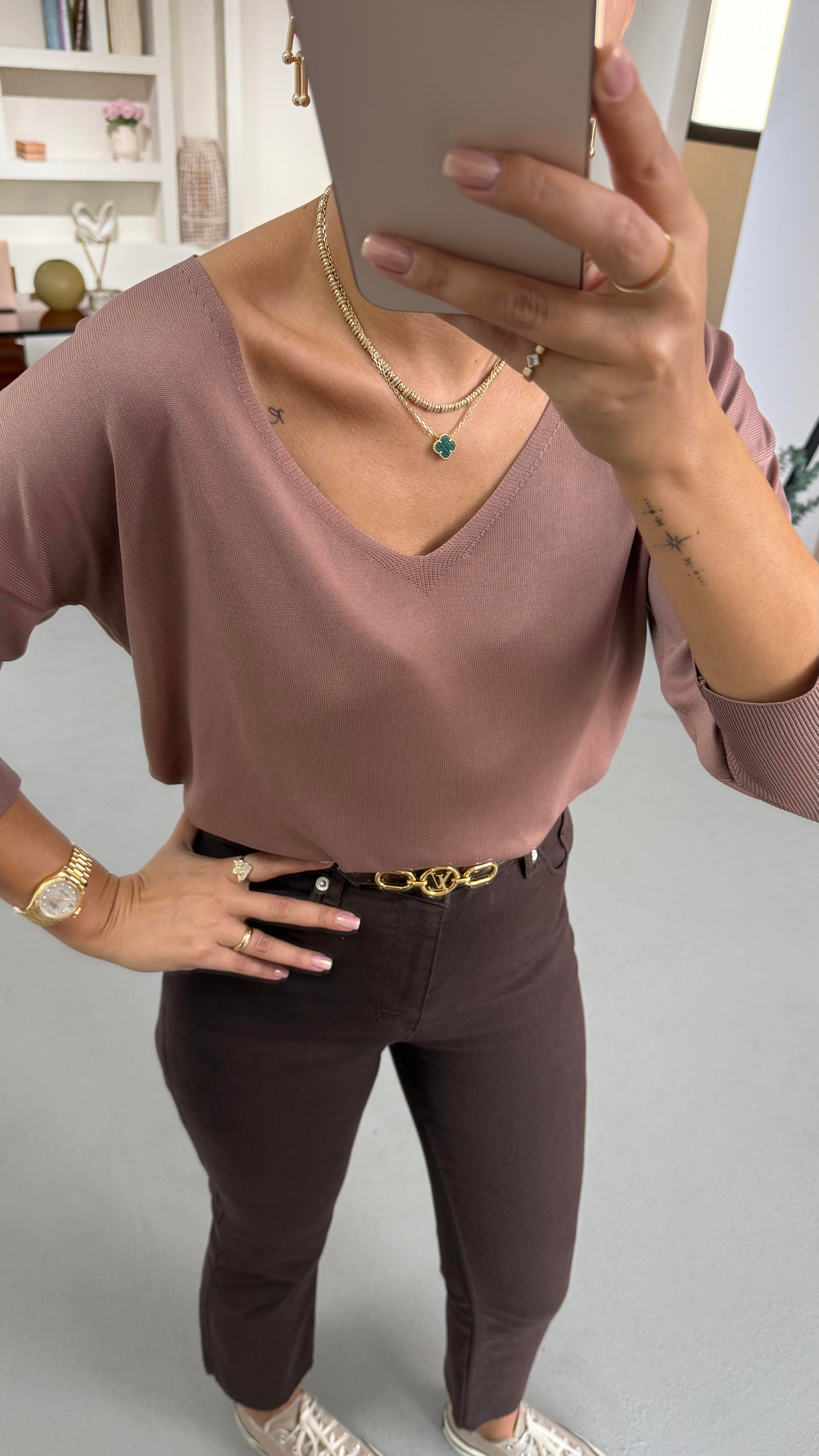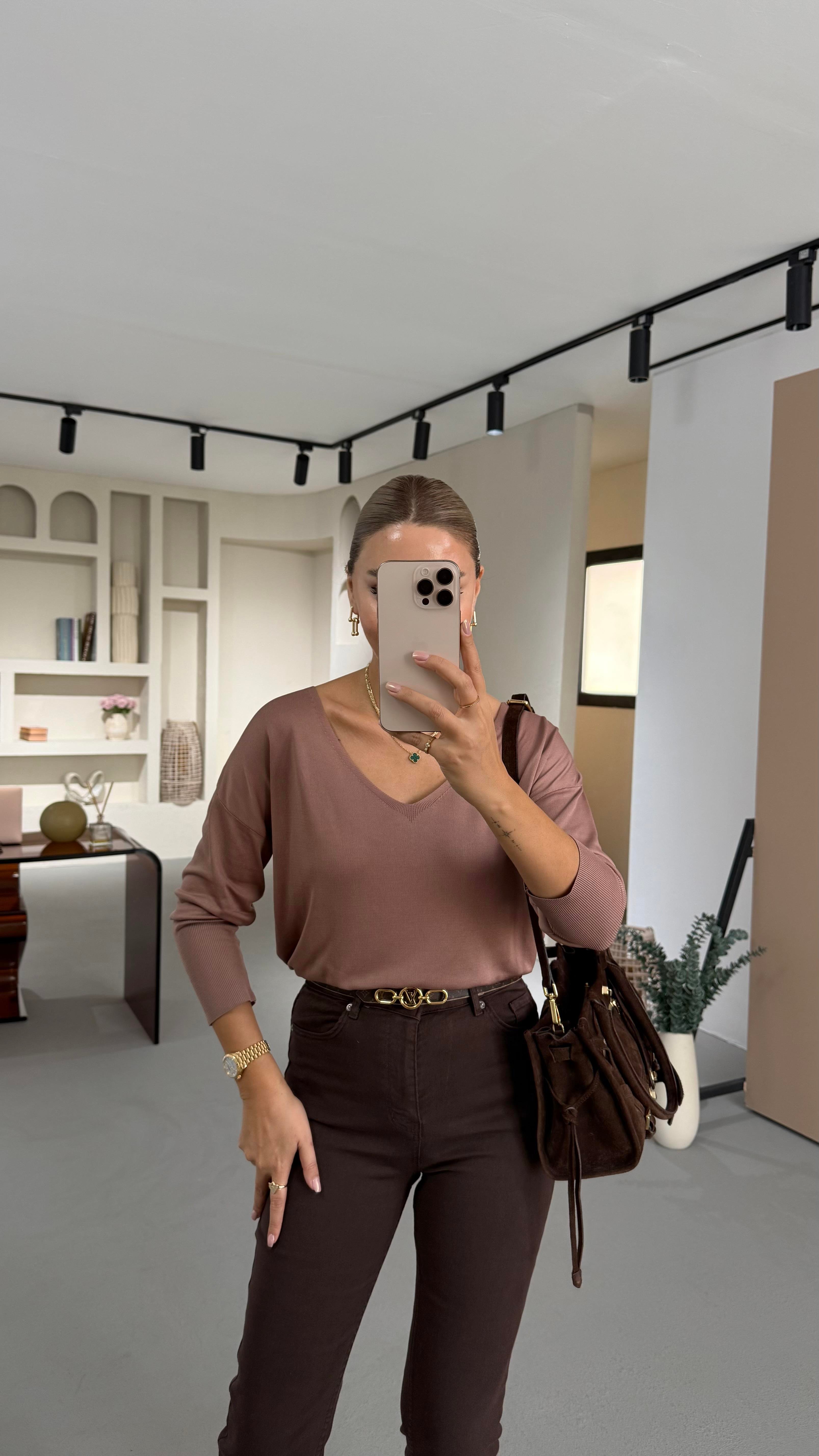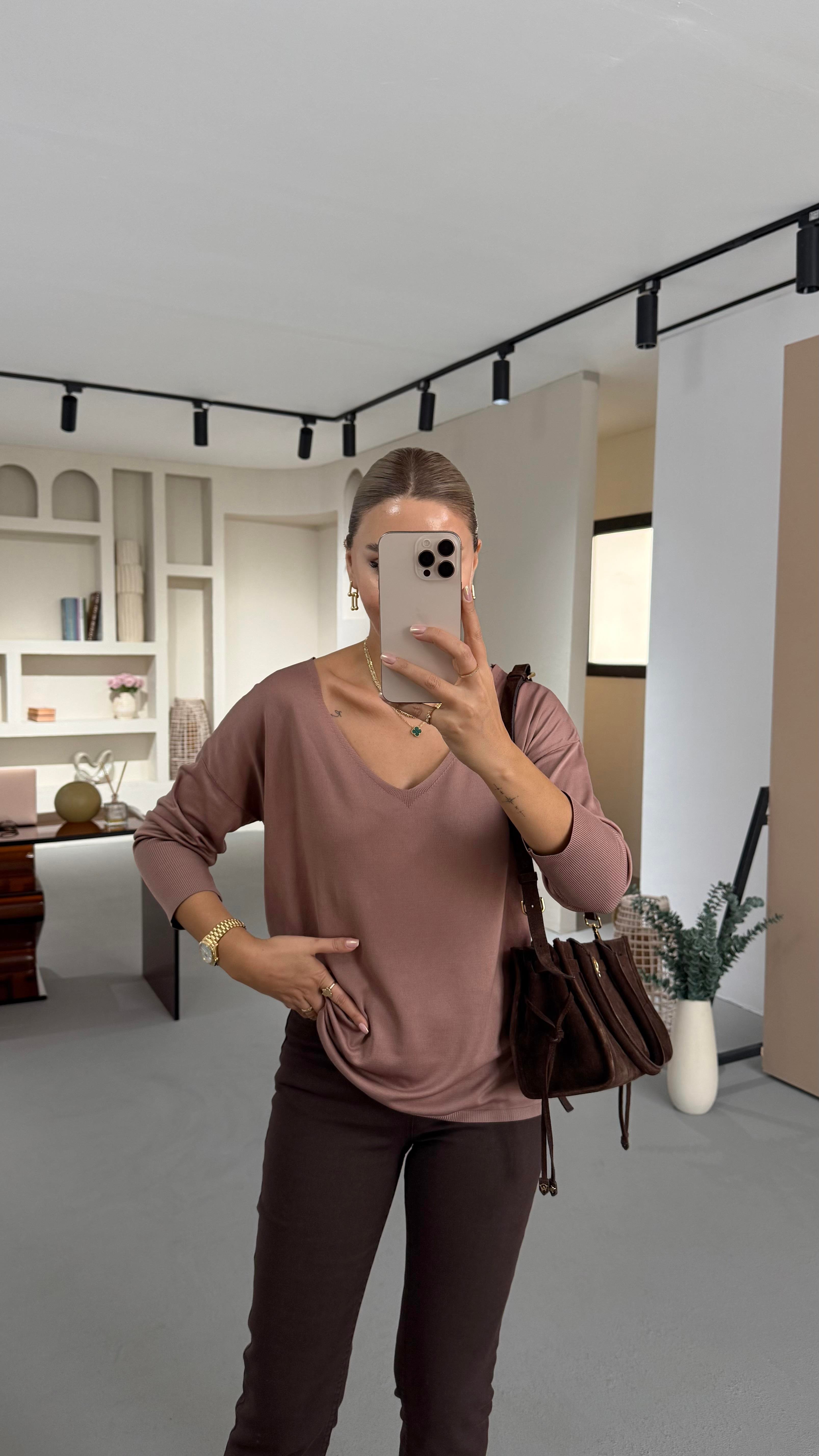 V Yaka Dökümlü Vizon Triko Bluz