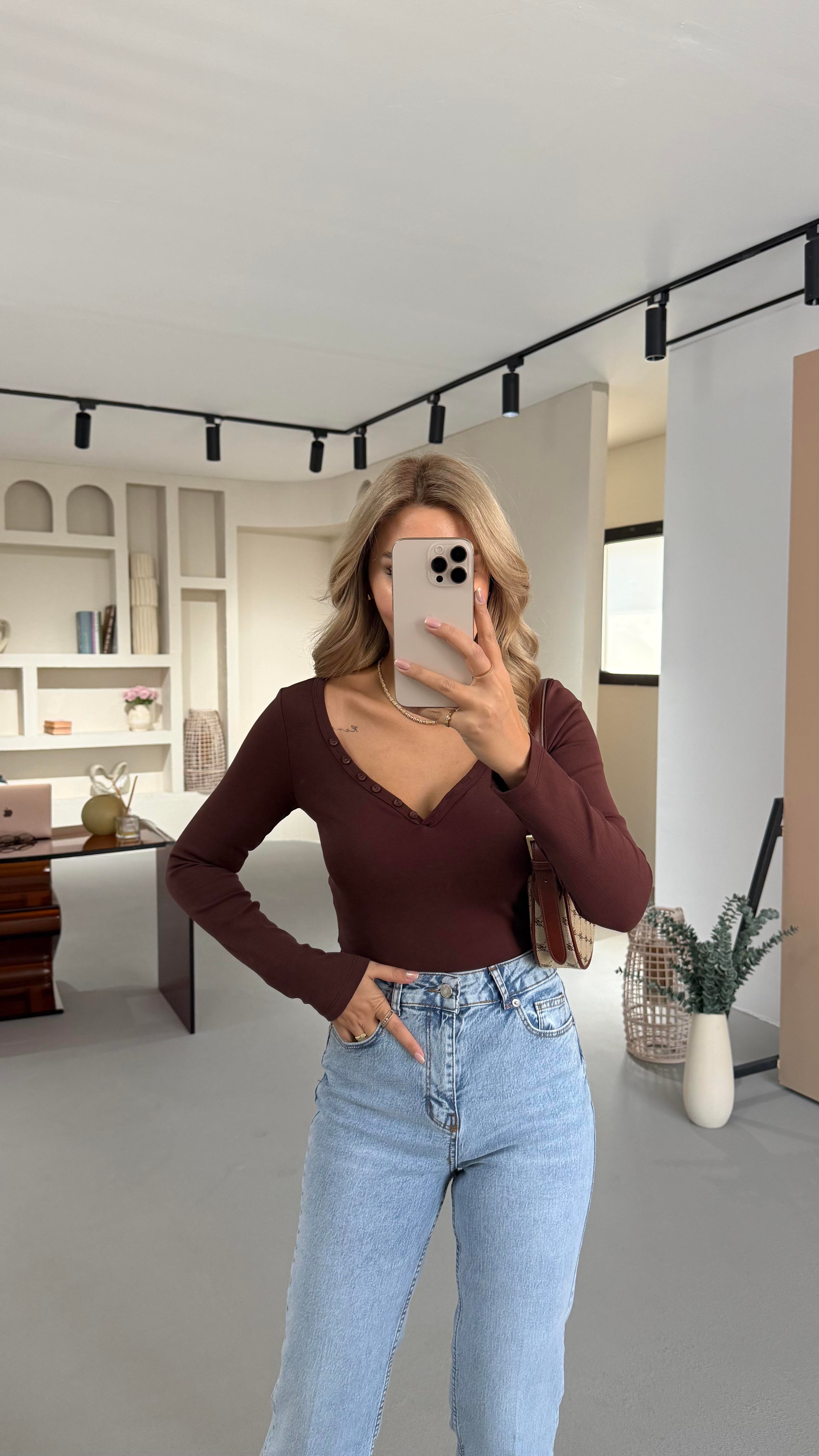 V Yaka Düğme Detay Kahve Bluz