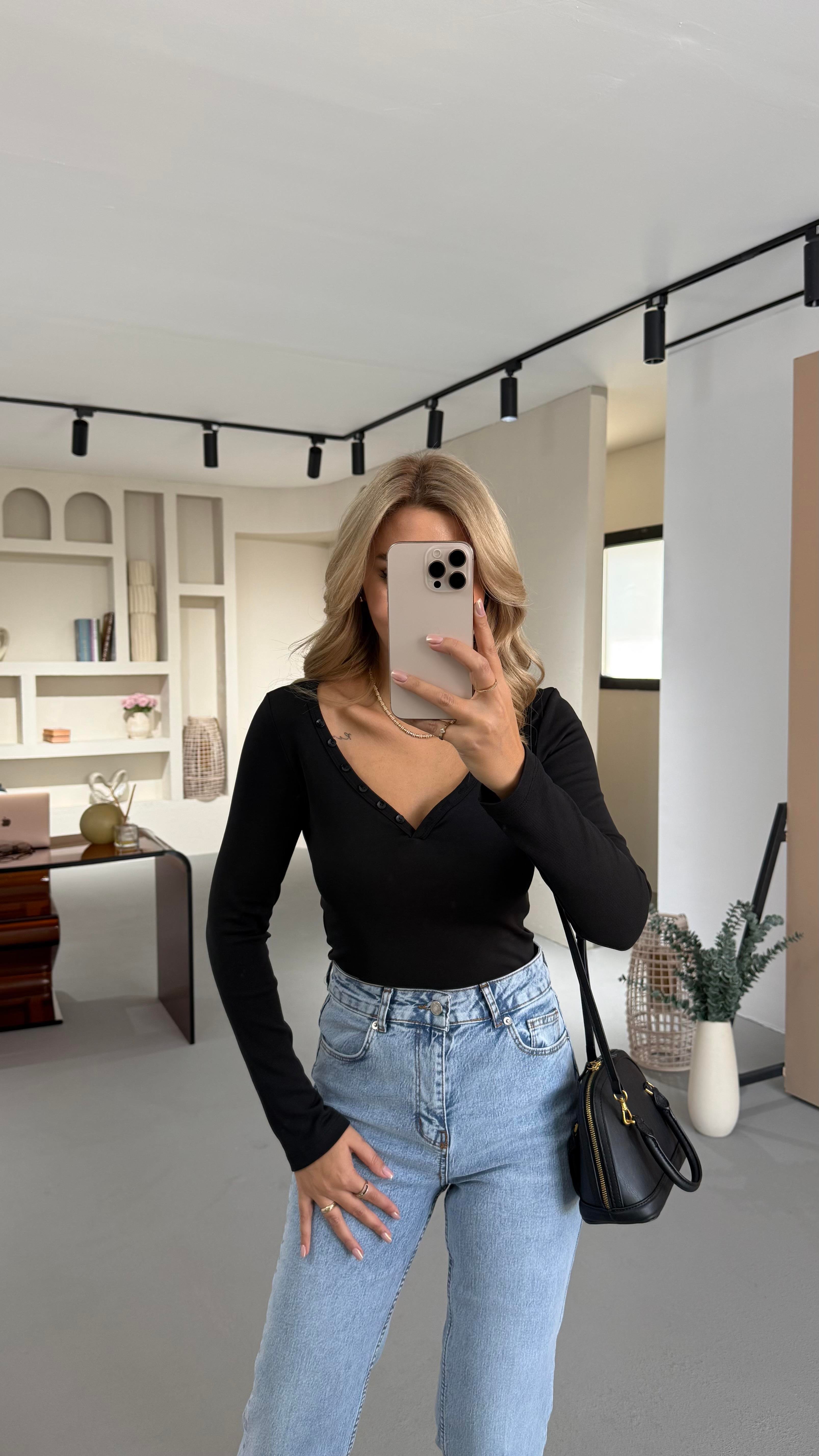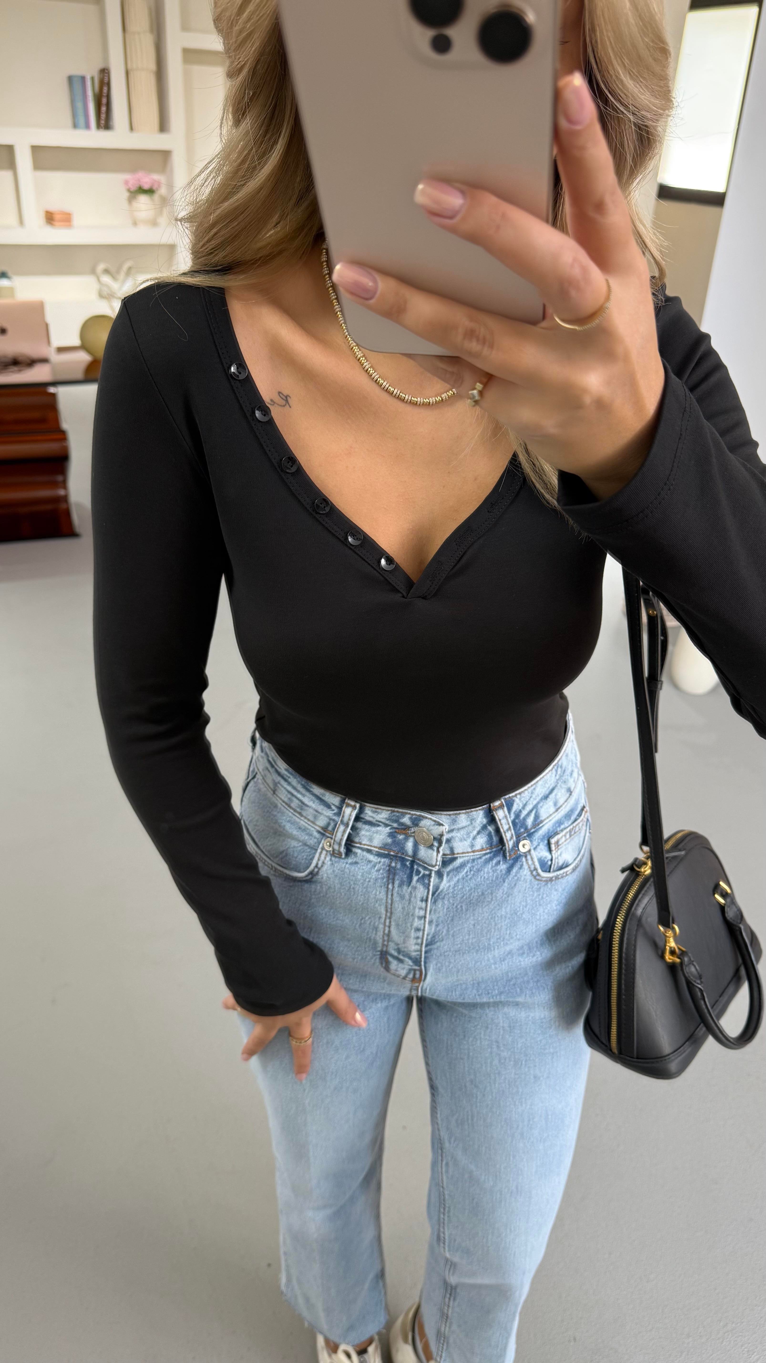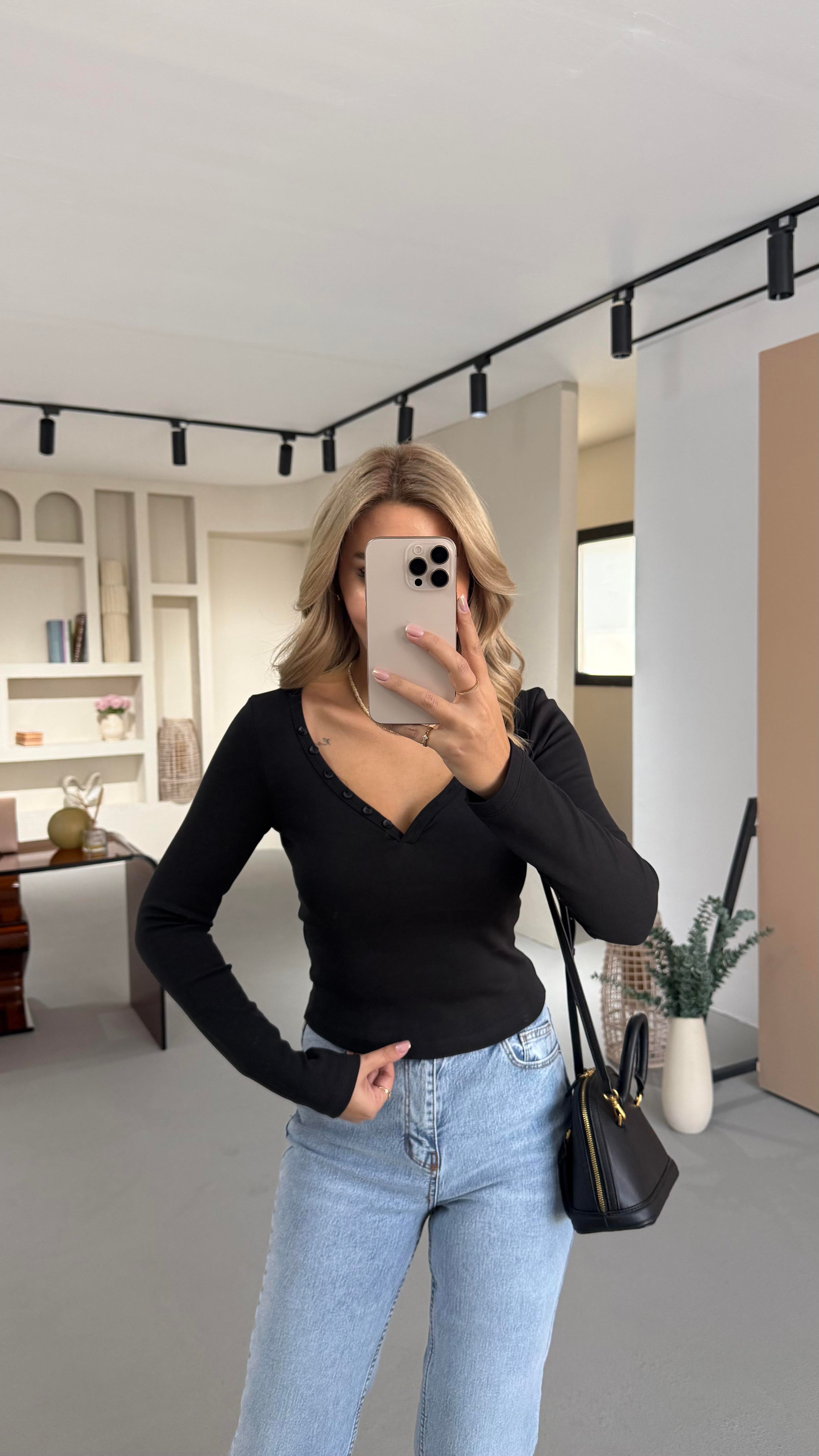 V Yaka Düğme Detay Siyah Bluz
