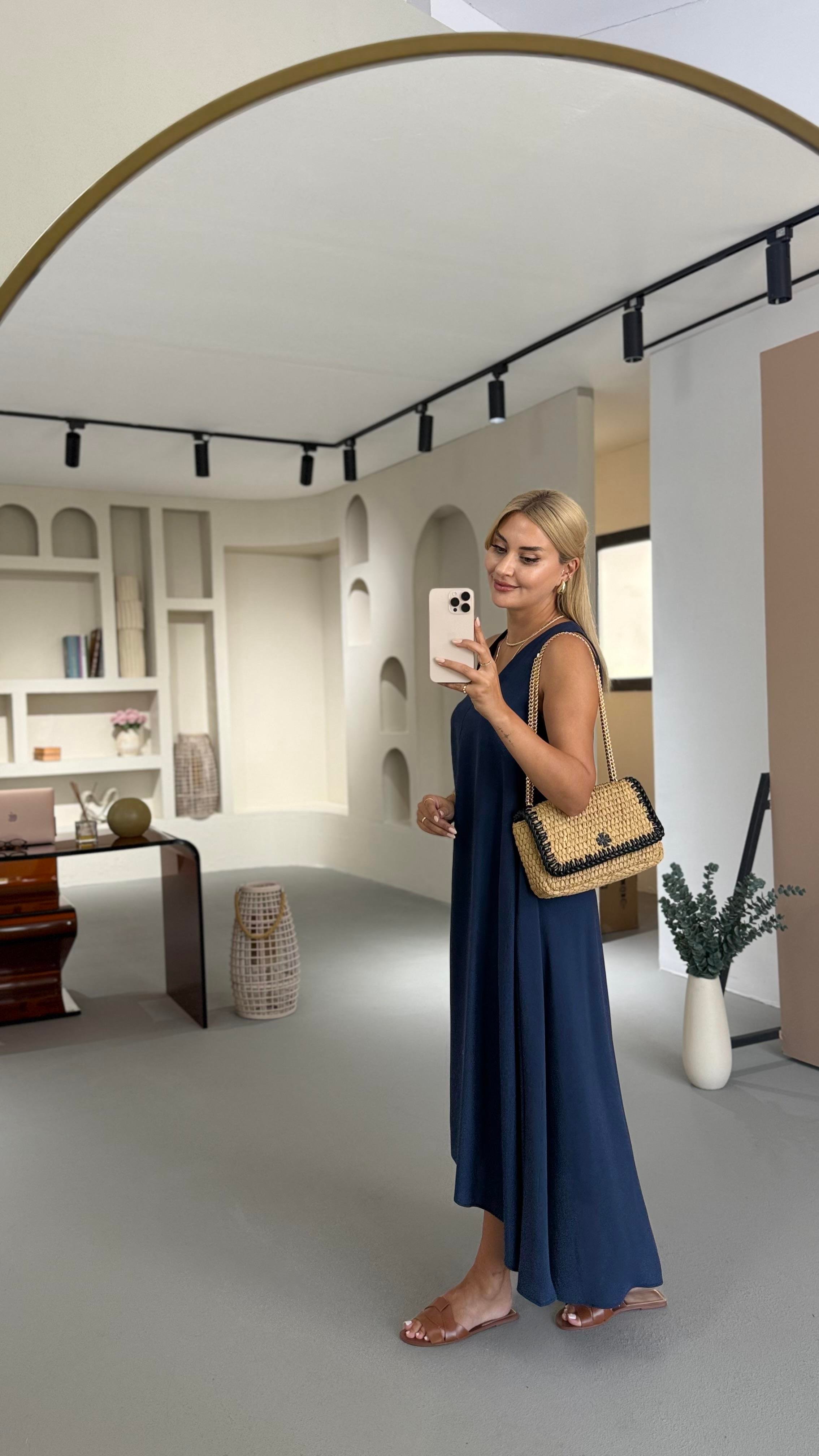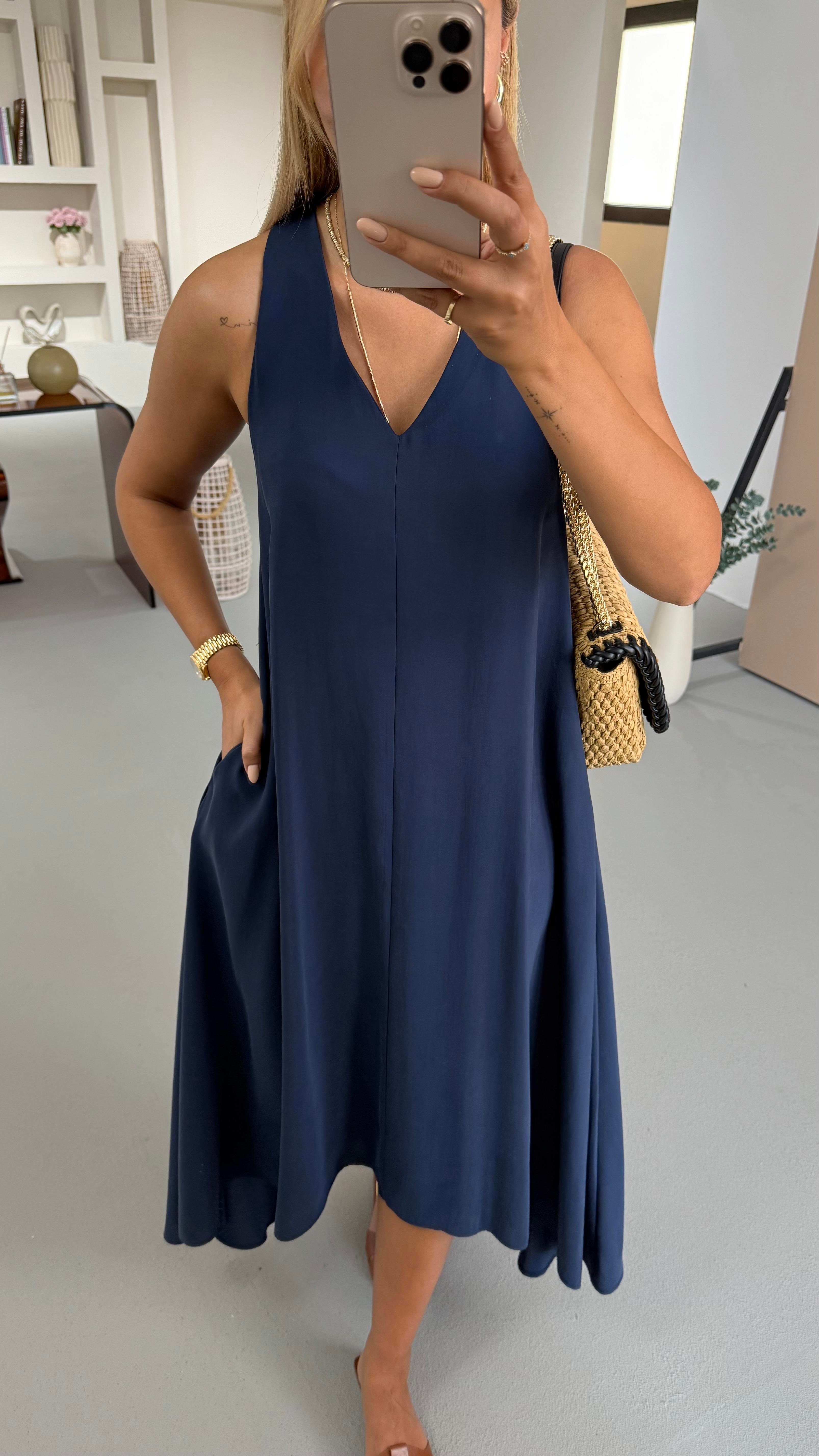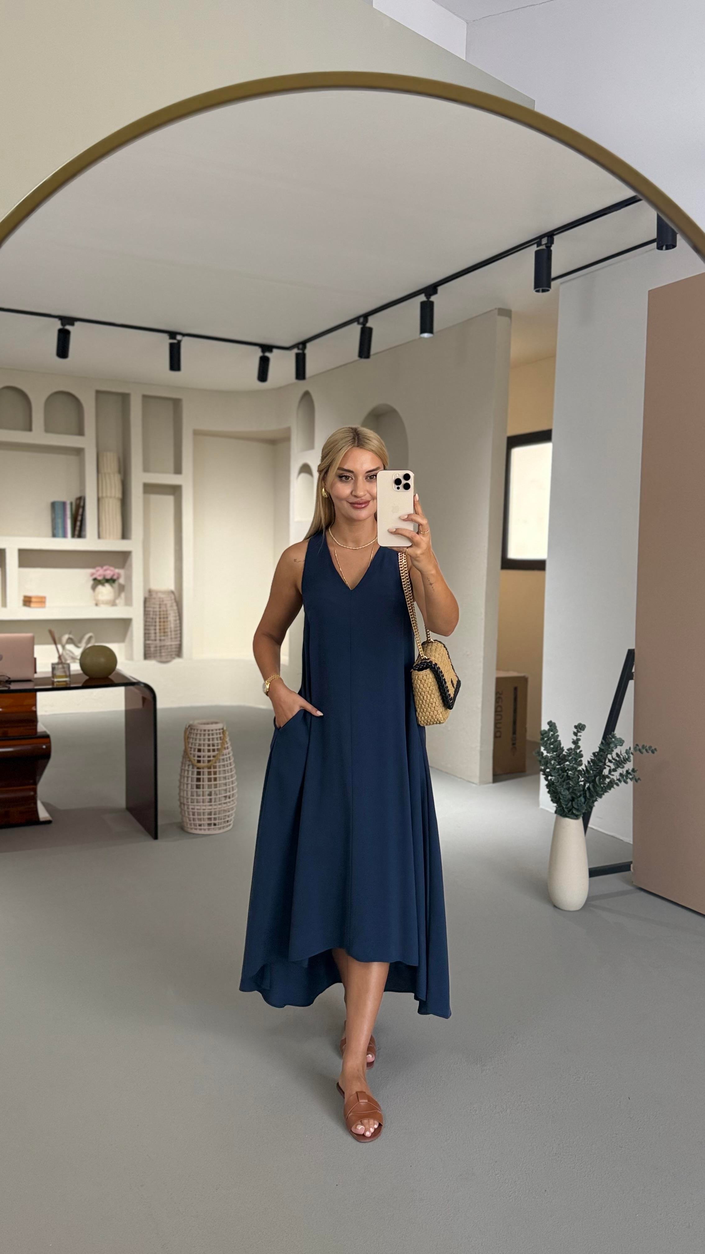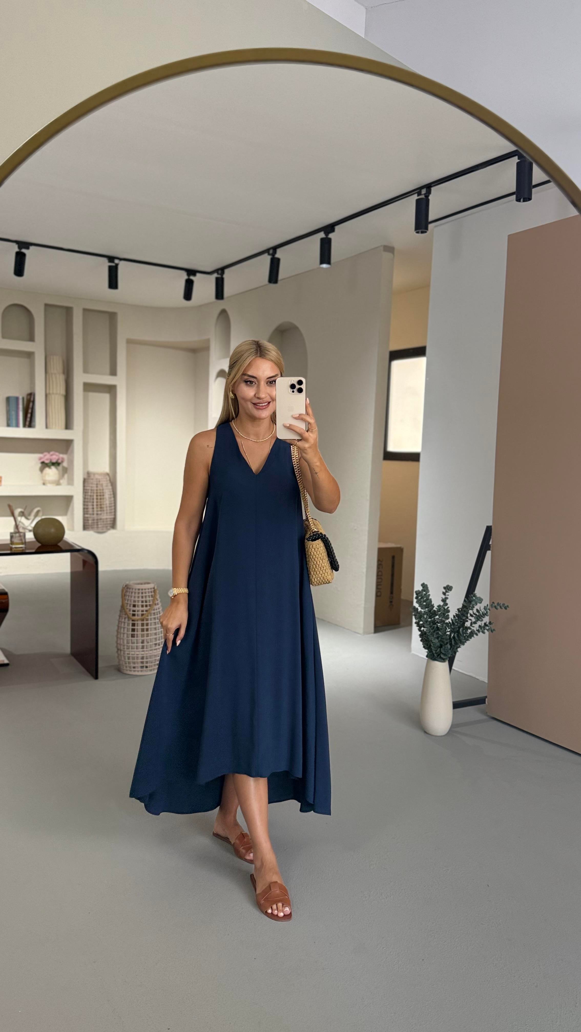 V Yaka Lacivert Tensel Modal Asimetrik Elbise