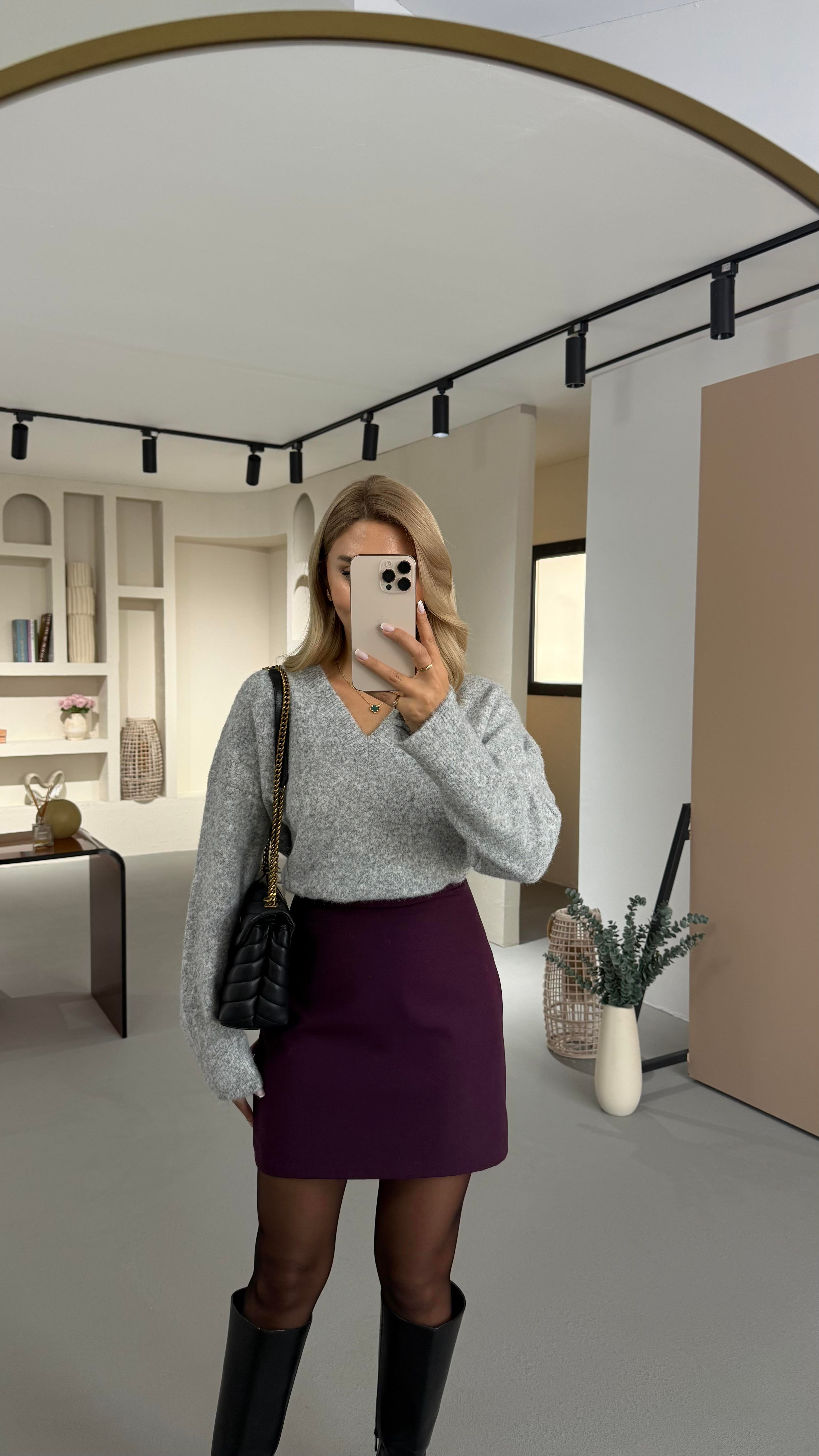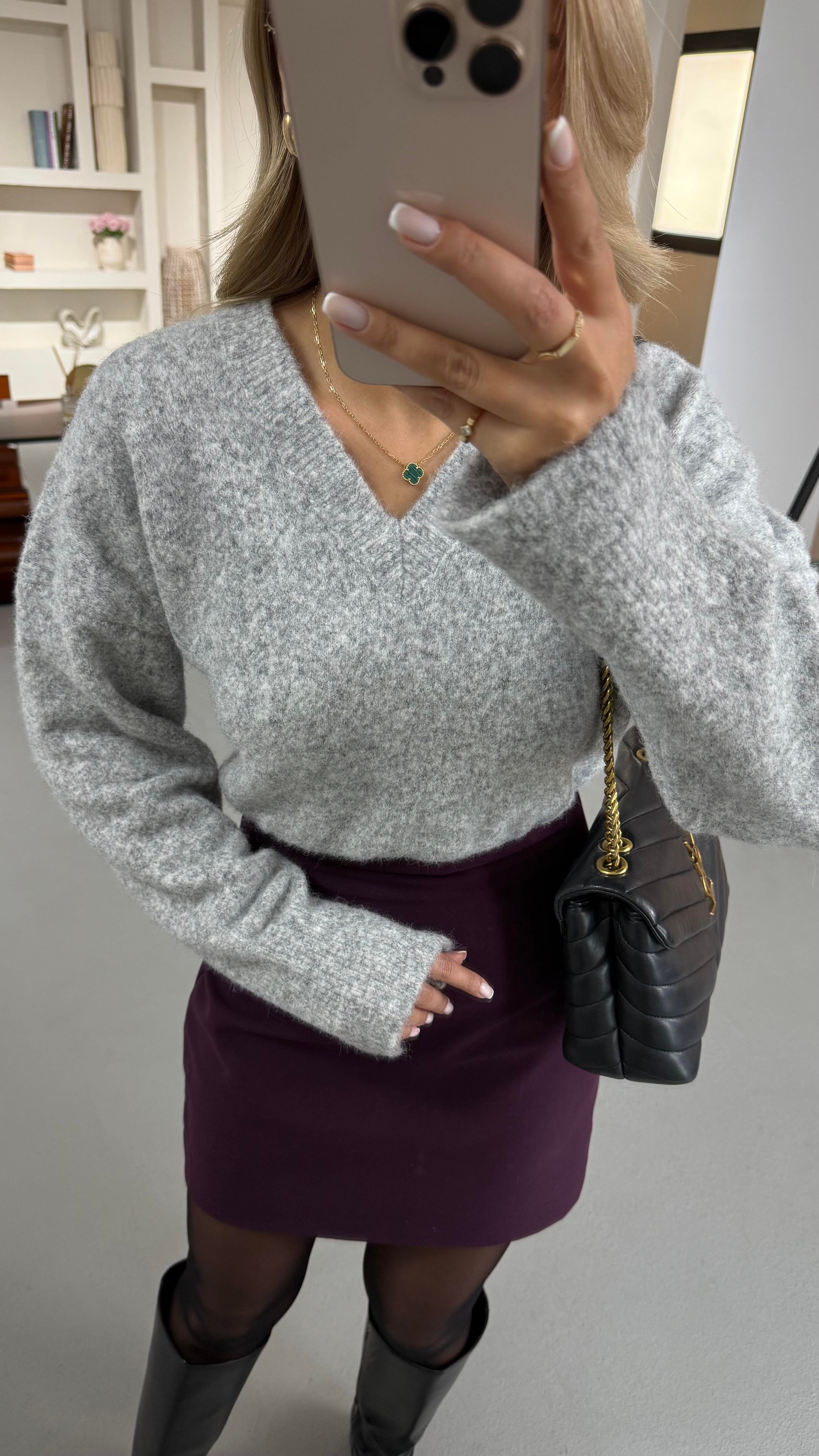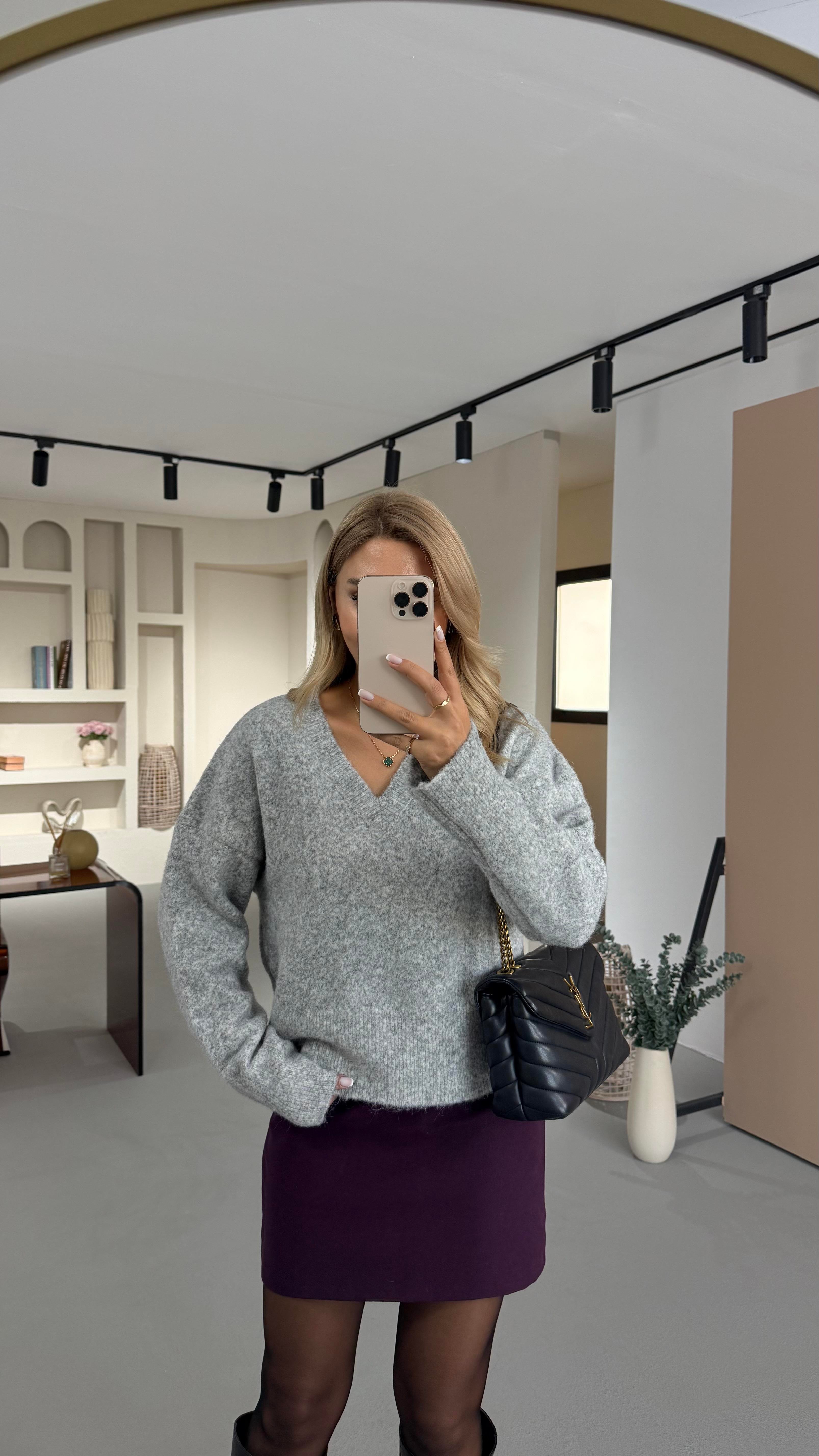 V Yaka Oversize Yumoş Gri Kazak (KZK-0126-GRİ)