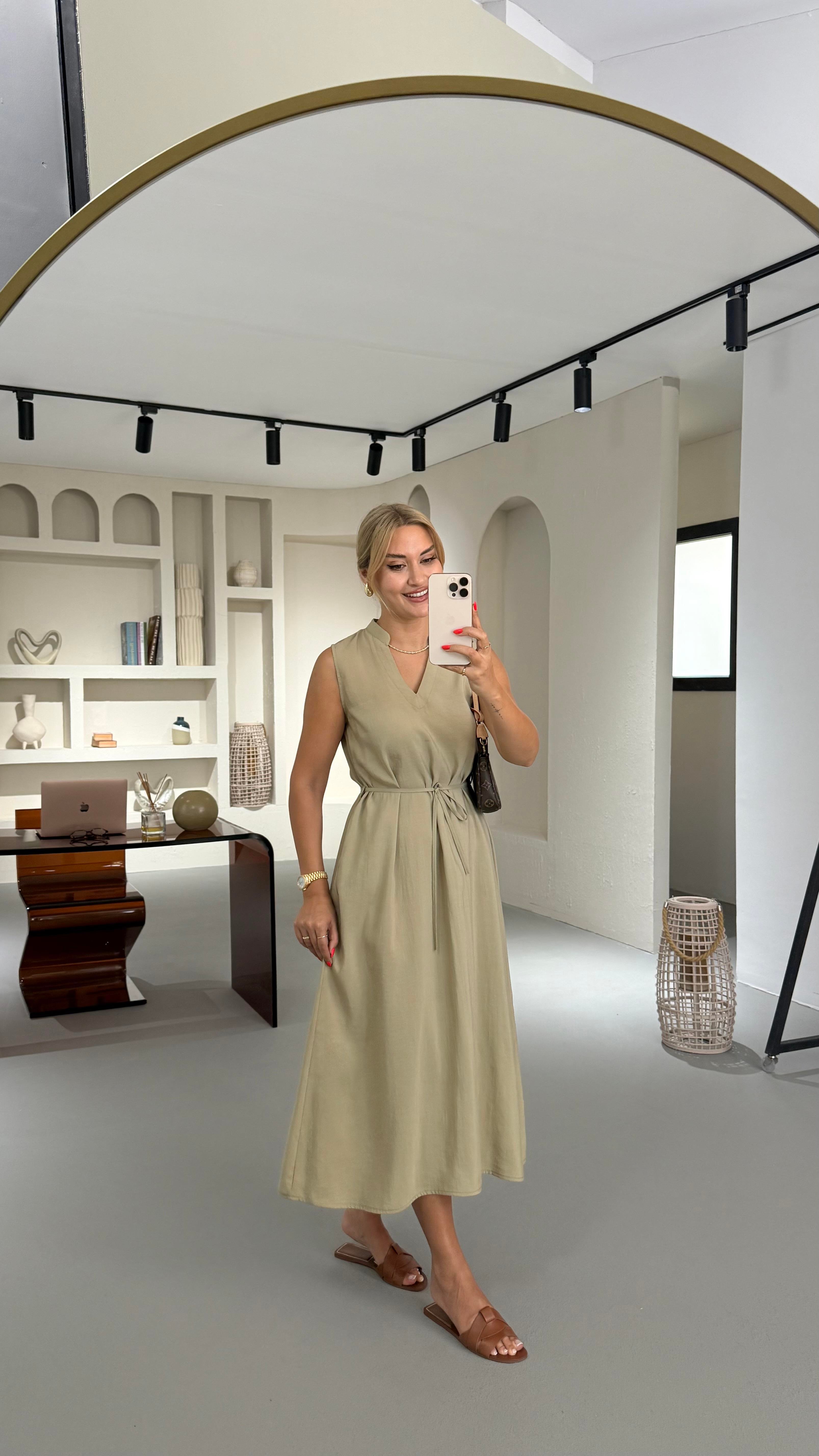 V Yaka Yağ Yeşili Tensel Modal Elbise (ELB-0727-YAĞ.YŞL)