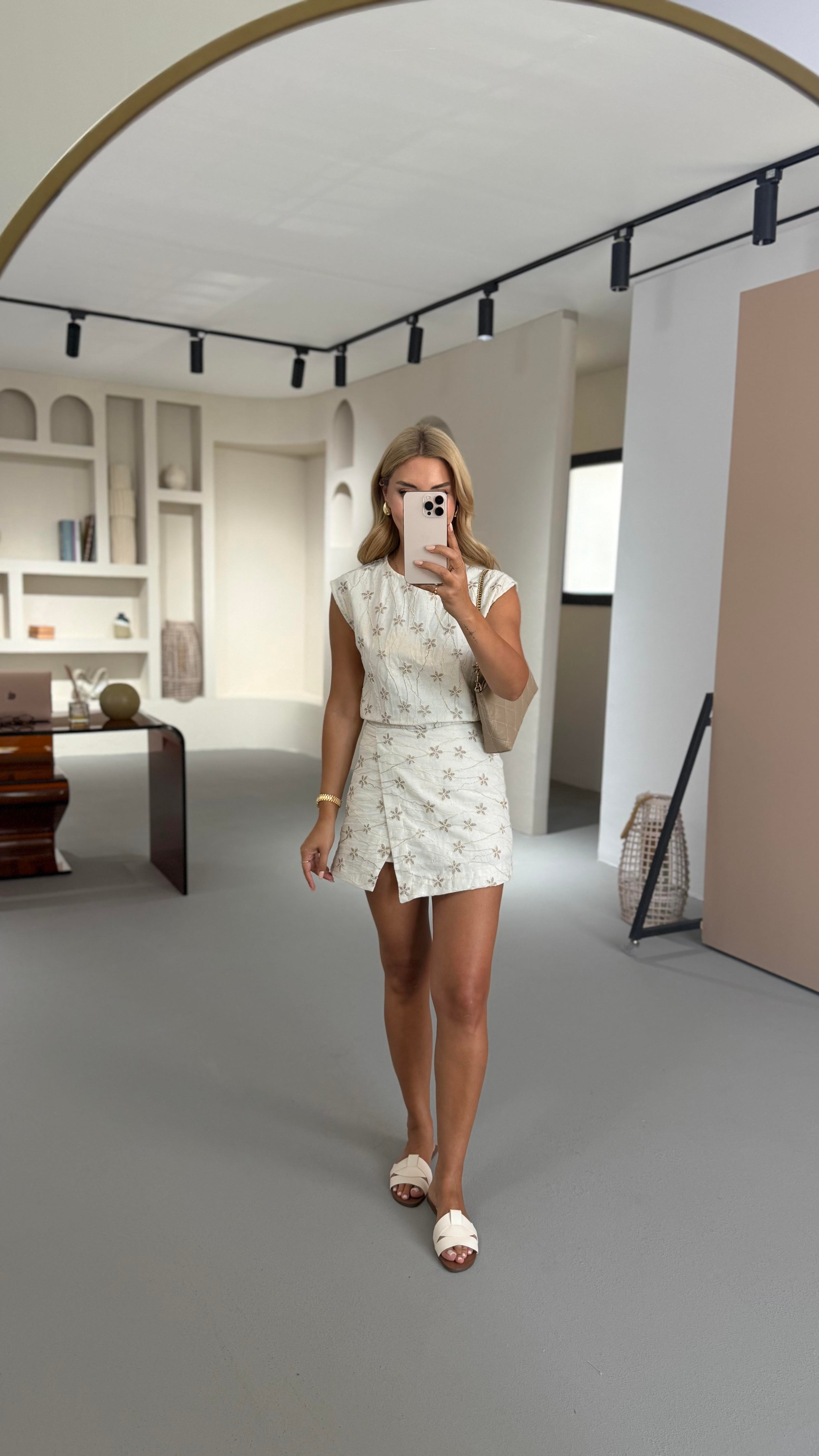 Vizon Nakış Detay Natural Keten Şort Etek