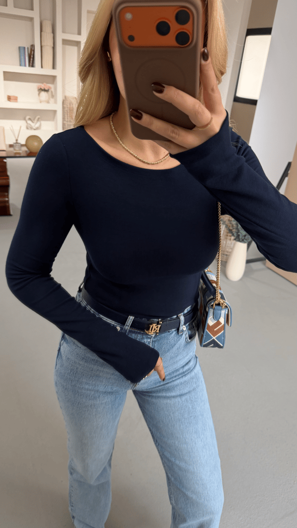 Geniş Yaka Lacivert Pamuklu Basic Bluz