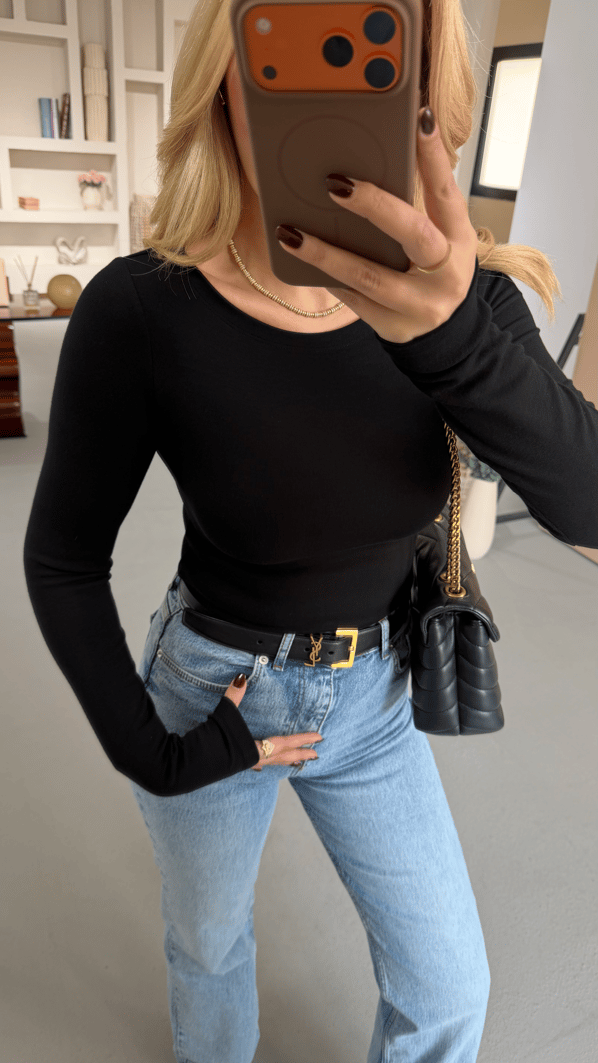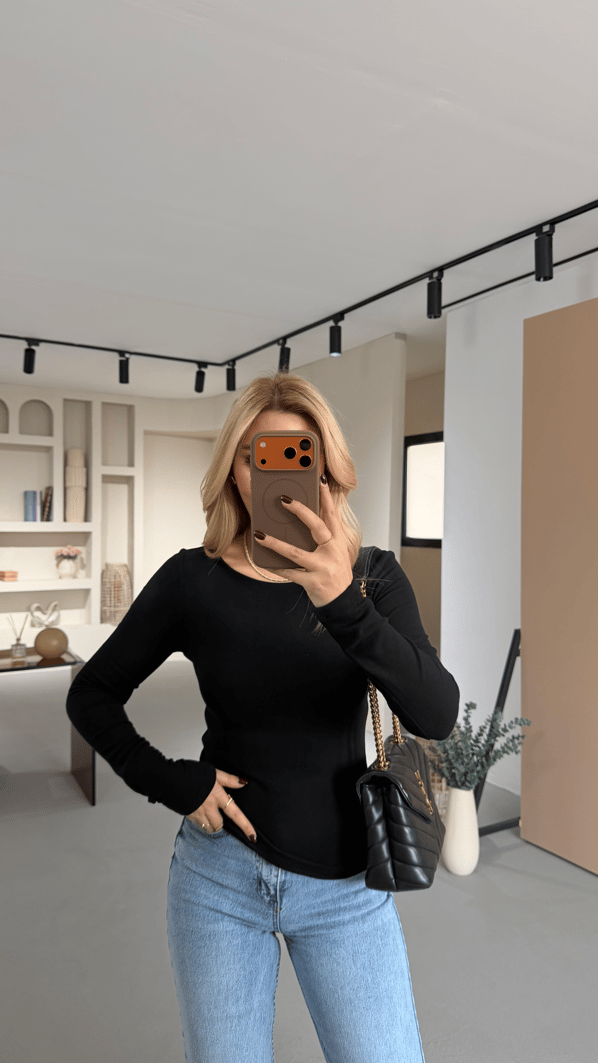Geniş Yaka Siyah Pamuklu Basic Bluz