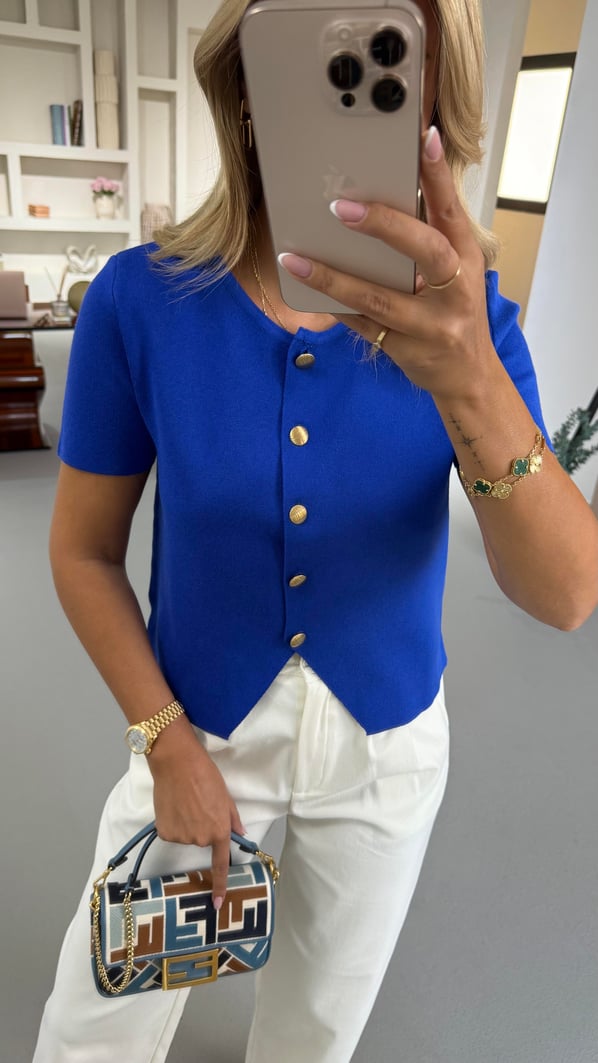 Gold Düğme Detay Kısa Kol Saks Triko Hırka (HRK-0076-SAKS)