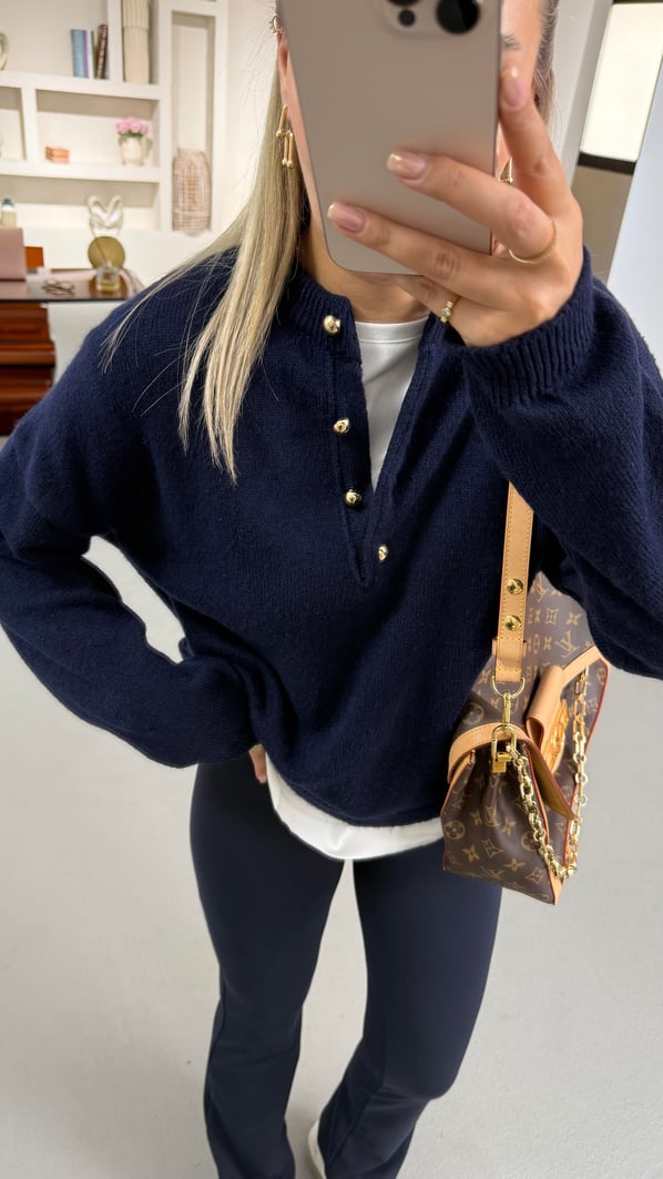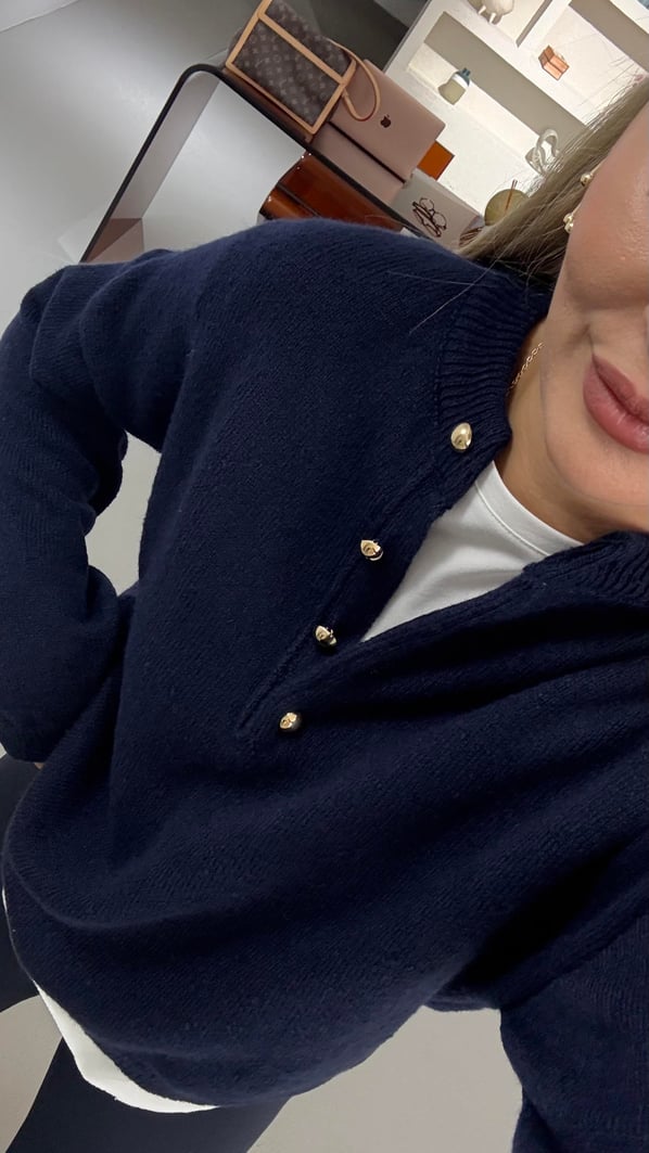 Gold Düğme Detay Lacivert Oversize Yumoş Kazak