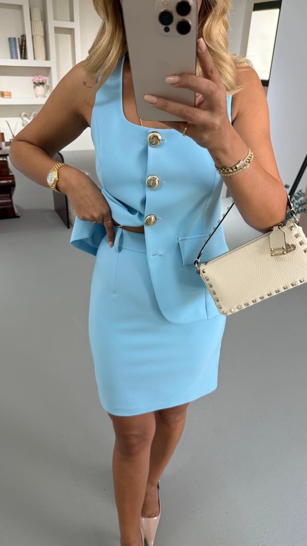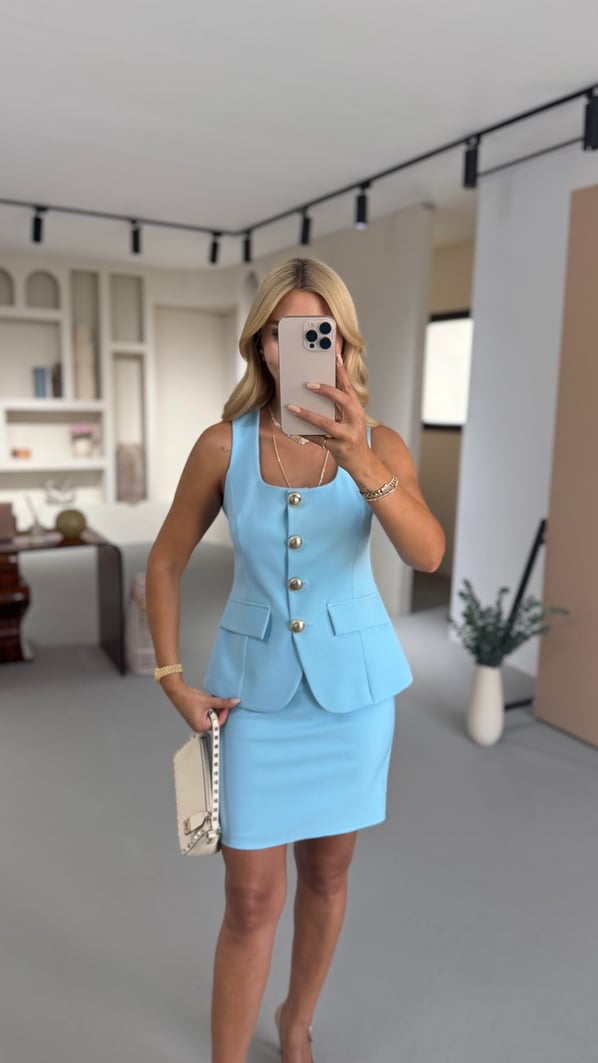 Gold Düğme Detay Yelek Etek Bebe Mavi Takım (TKM-0153-B.MAVİ)