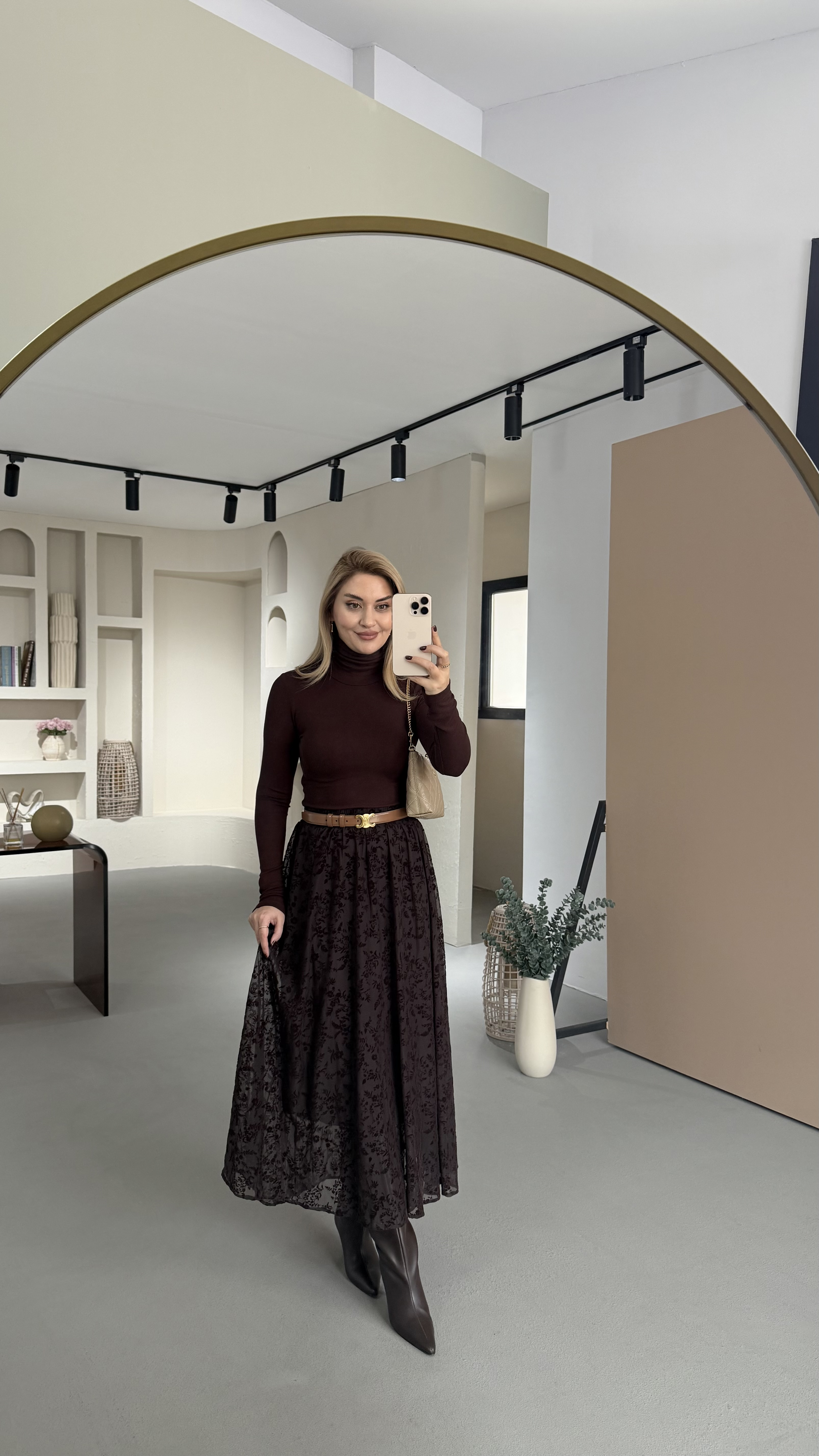 Kadife Kabartmalı Kahve Tül Etek (ETK-0283-KHV)