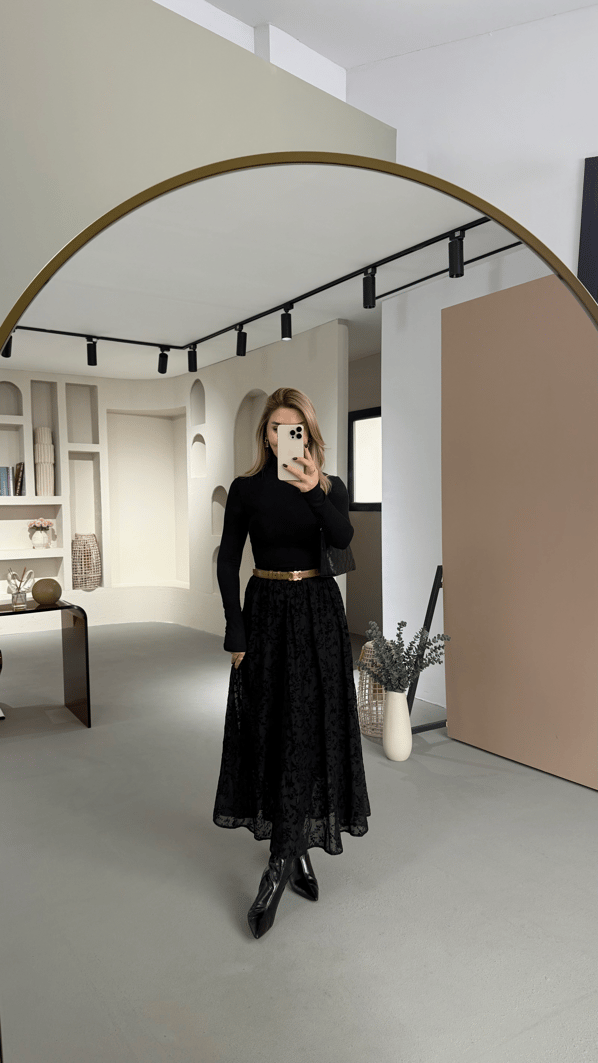 Kadife Kabartmalı Siyah Tül Etek