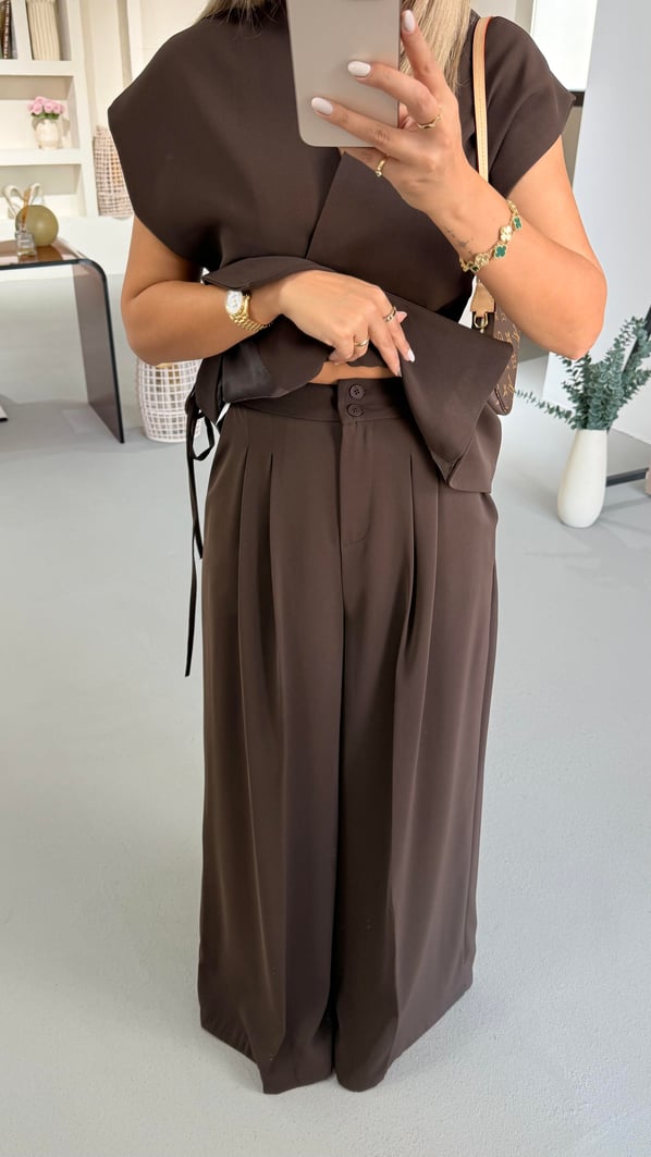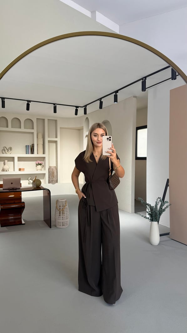 Kahve Çift Piliseli Bol Pantolon Yelek Takım