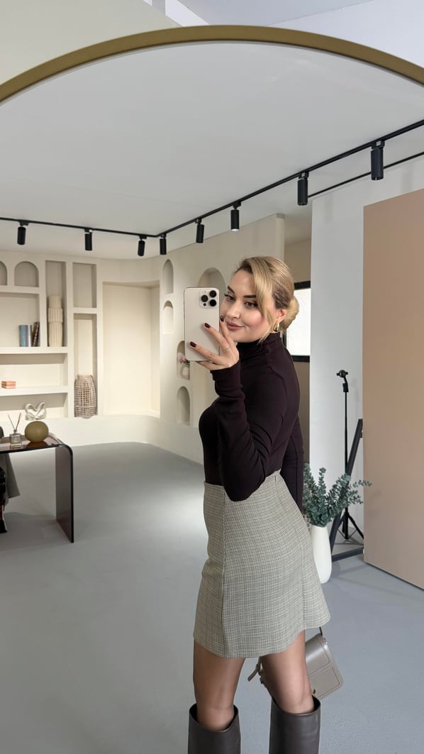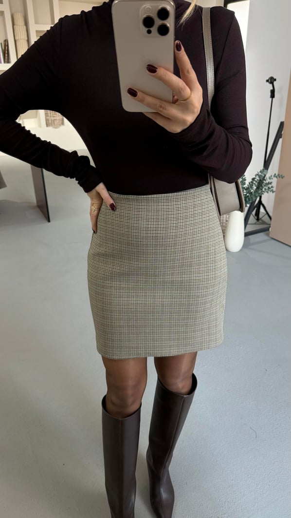 Kahve Kaz Ayağı Desen Mini Etek