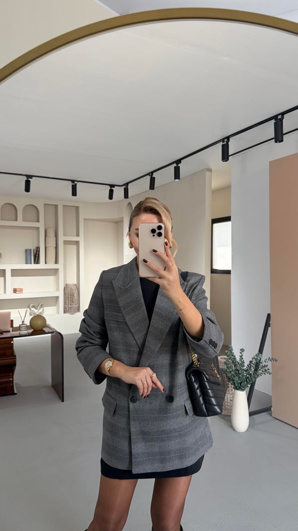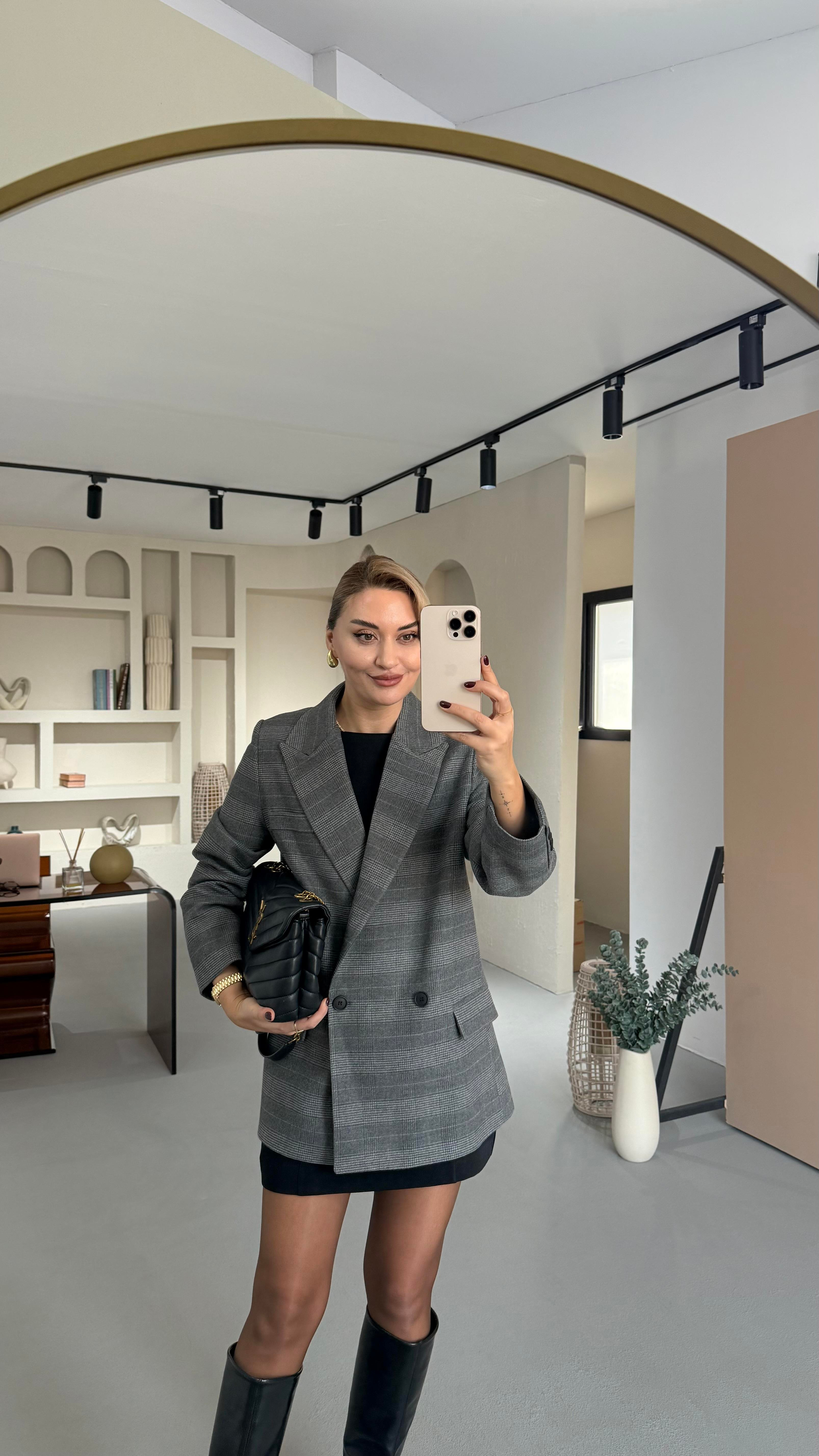 Kapak Cep Detay Gri Ekoseli Blazer (CKT-0186-GRİ)