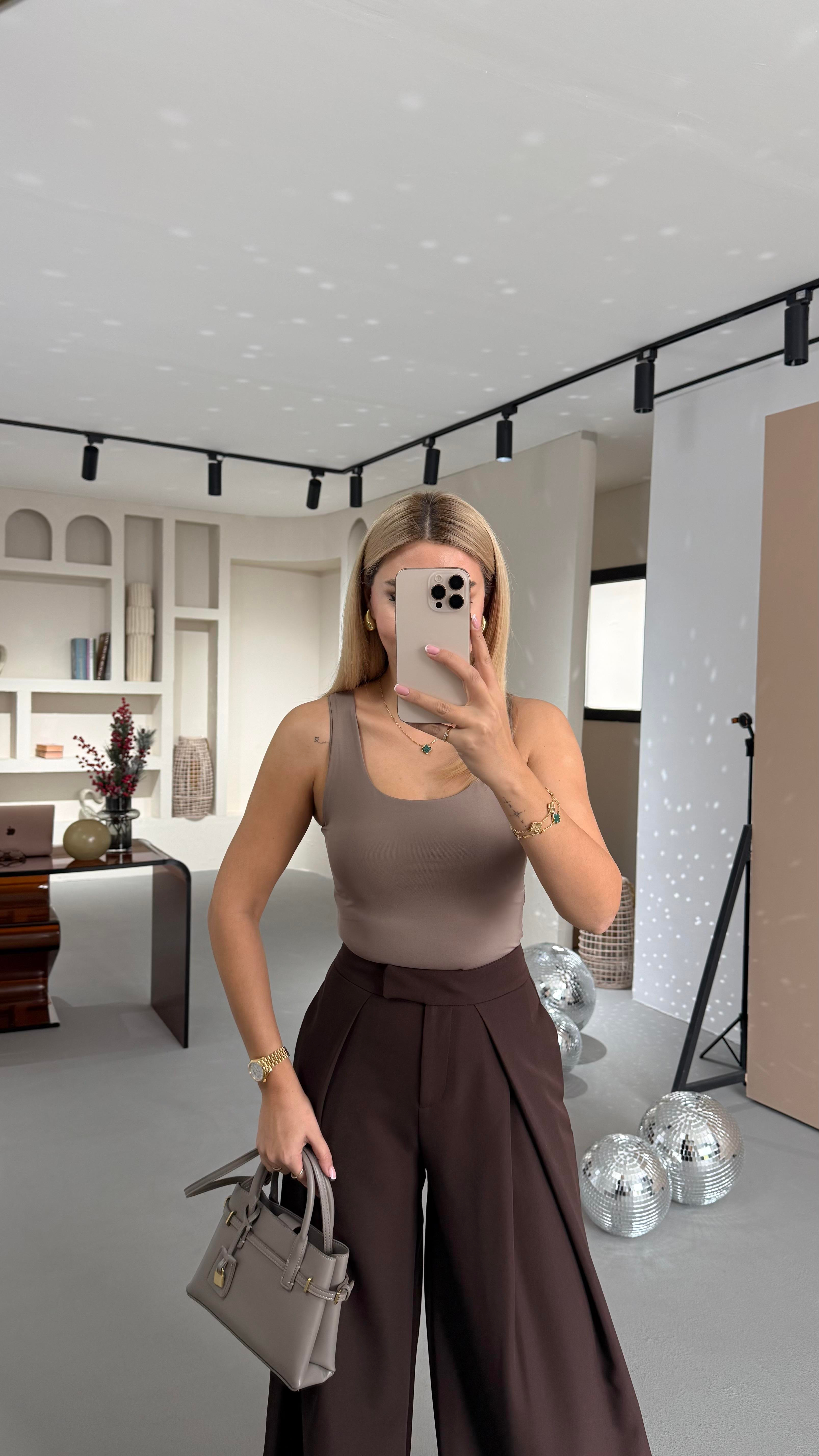 Kare Yaka Likralı Basic Vizon Bluz