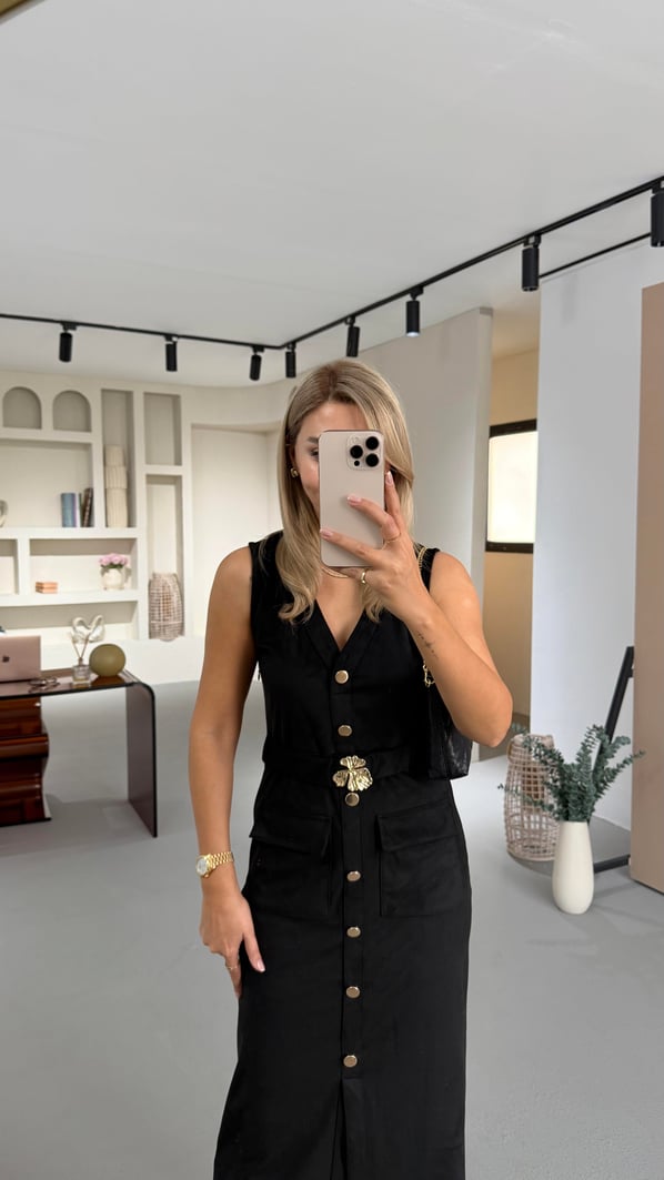 Kemer Aksesuarlı Gold Düğme Detay Siyah Süet Kalem Elbise