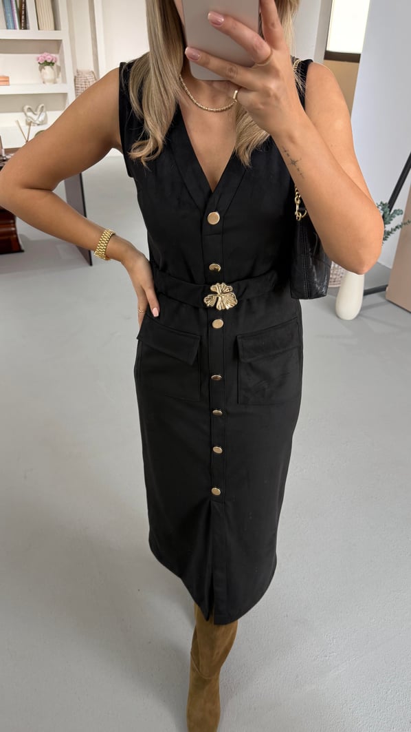 Kemer Aksesuarlı Gold Düğme Detay Siyah Süet Kalem Elbise (ELB-0755-SYH)