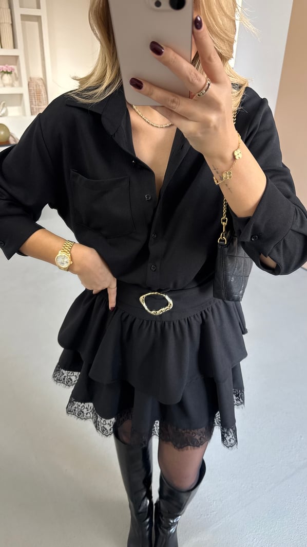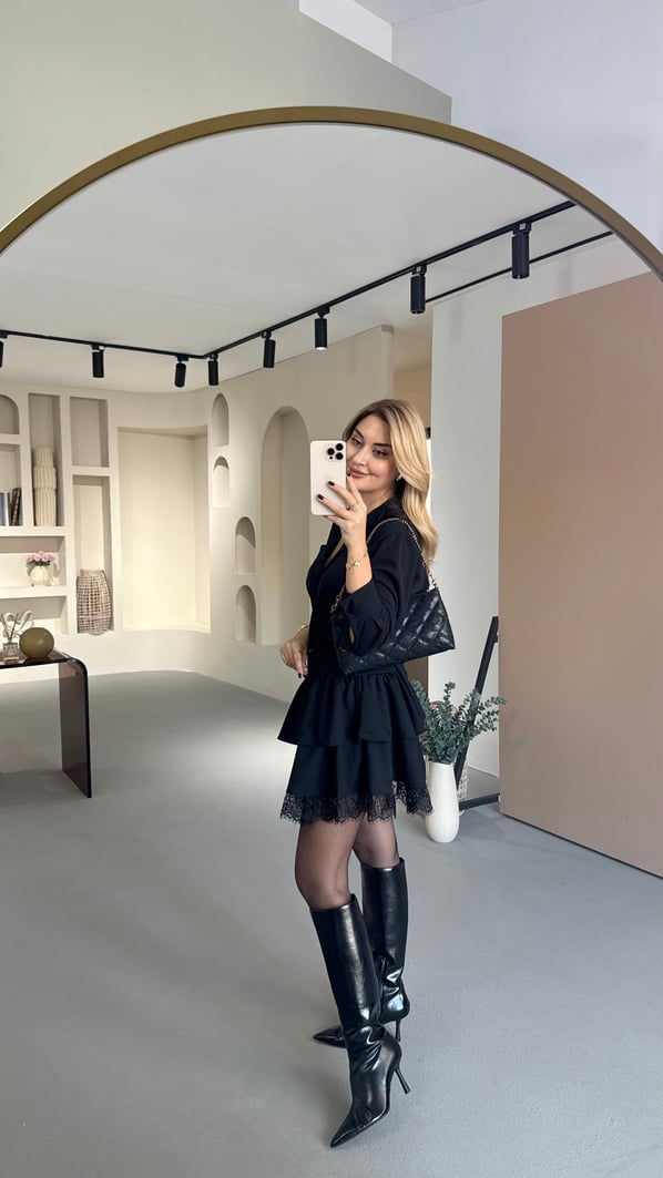 Kemerli Dantel Detay İçi Şortlu Siyah Elbise