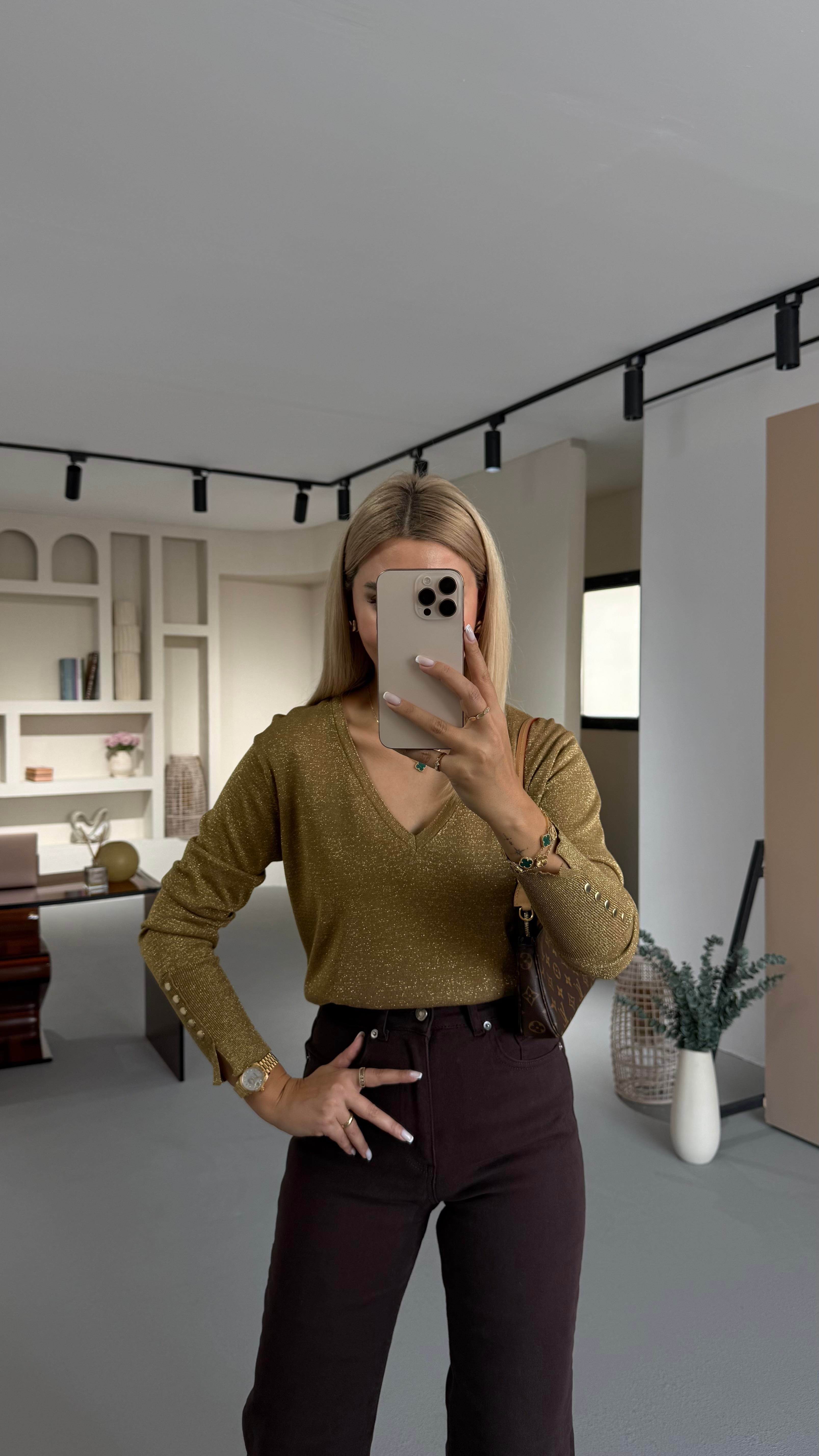 Kol Düğmeli V Yaka Gold Simli Triko Bluz