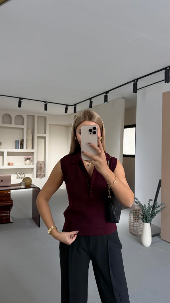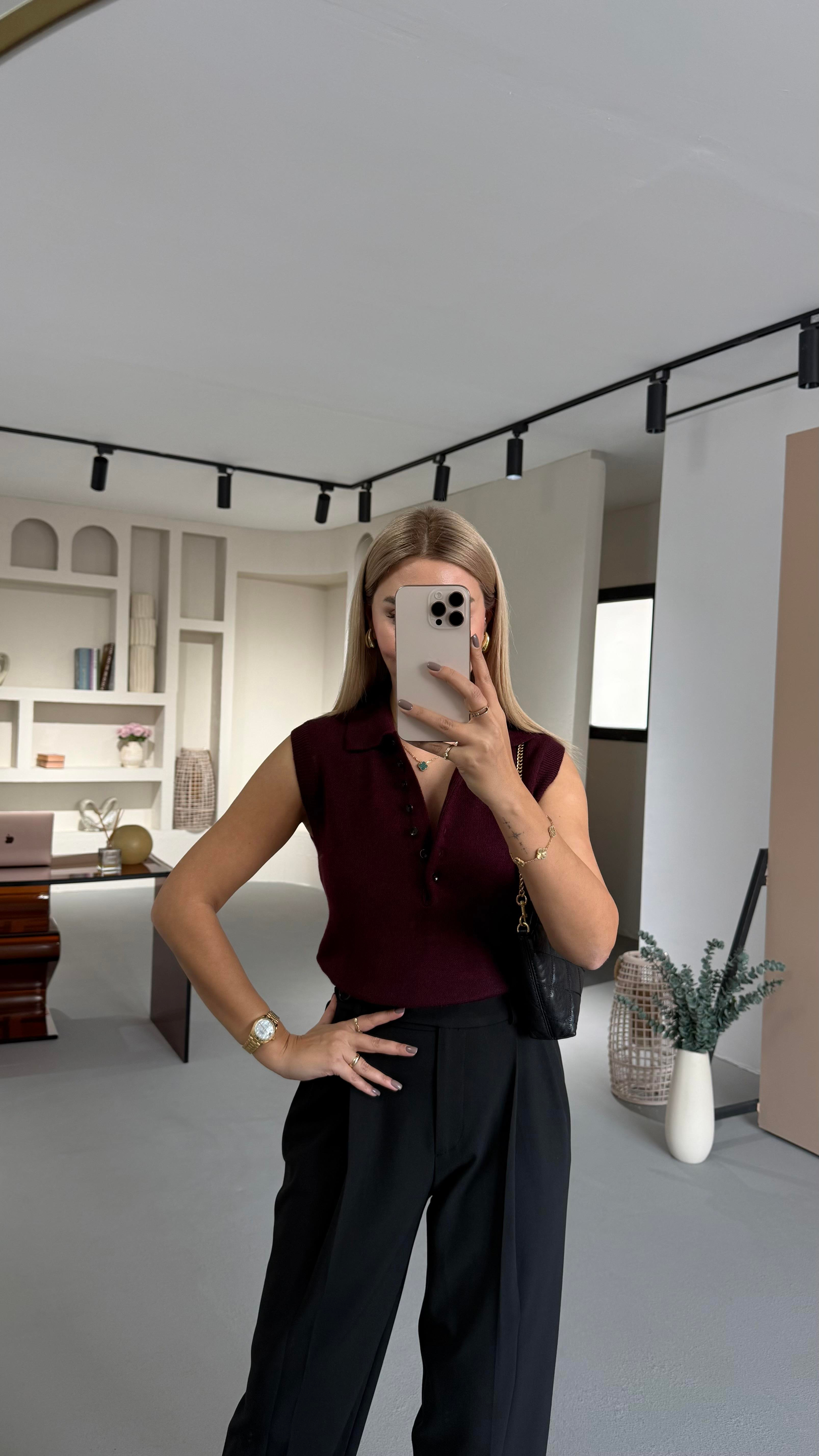 Kolsuz Polo Yaka Düğmeli Mürdüm Triko