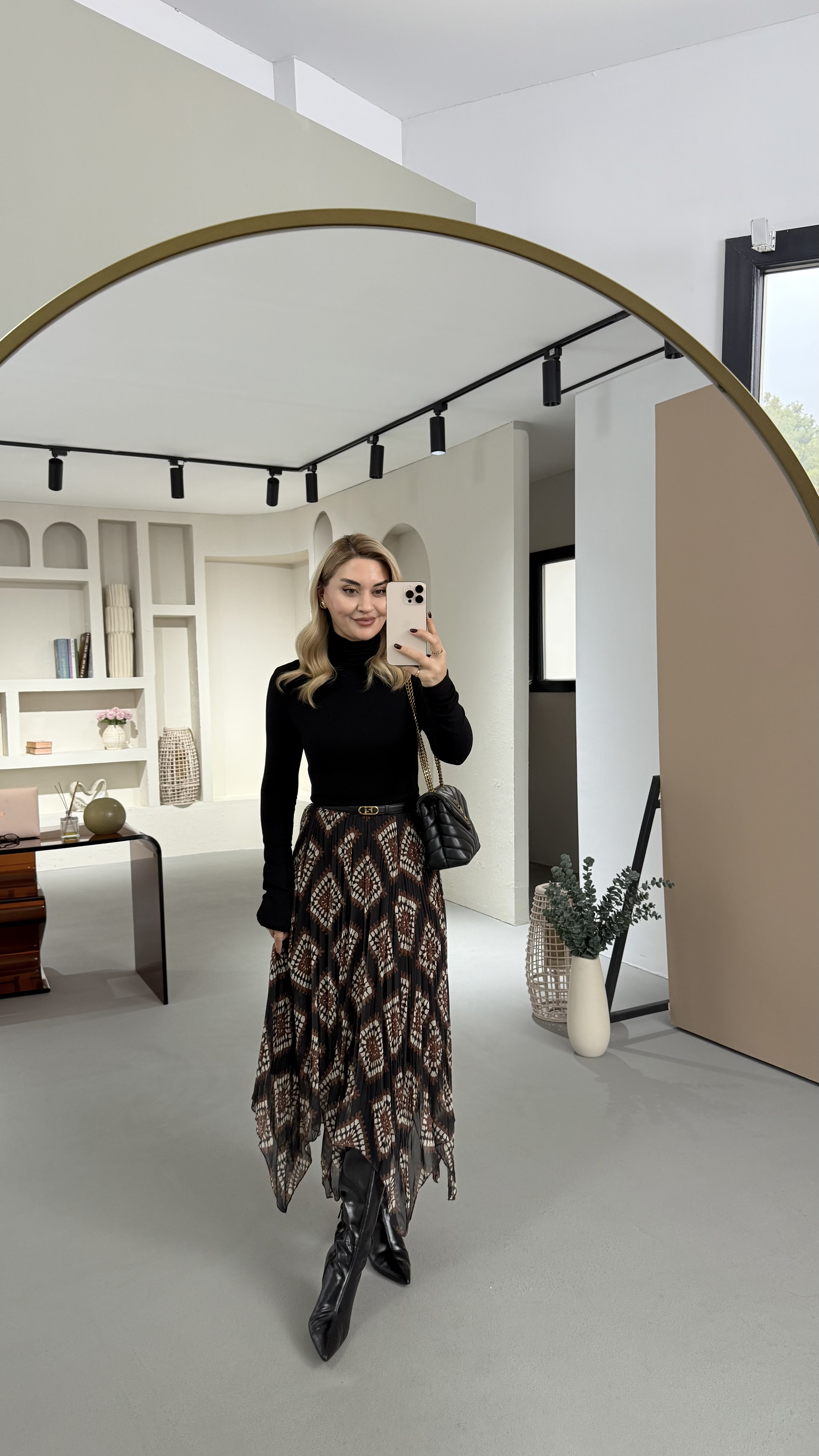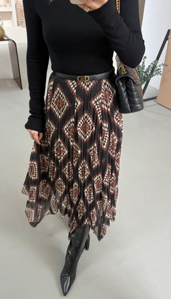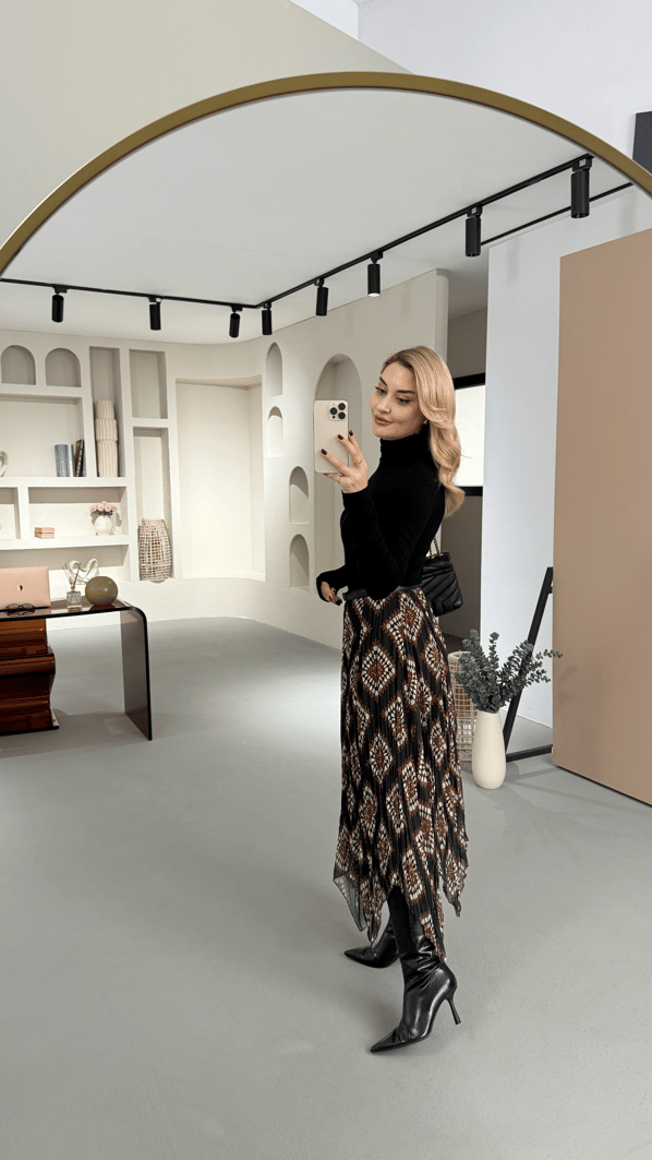 Krem Siyah Desen Beli Lastikli Asimetrik Şifon Etek