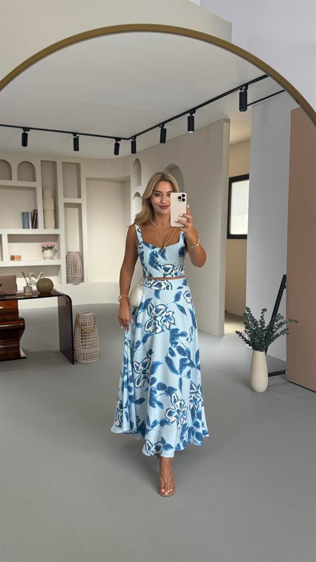 Mavi Desenli Tensel Büstiyer Etek Takım