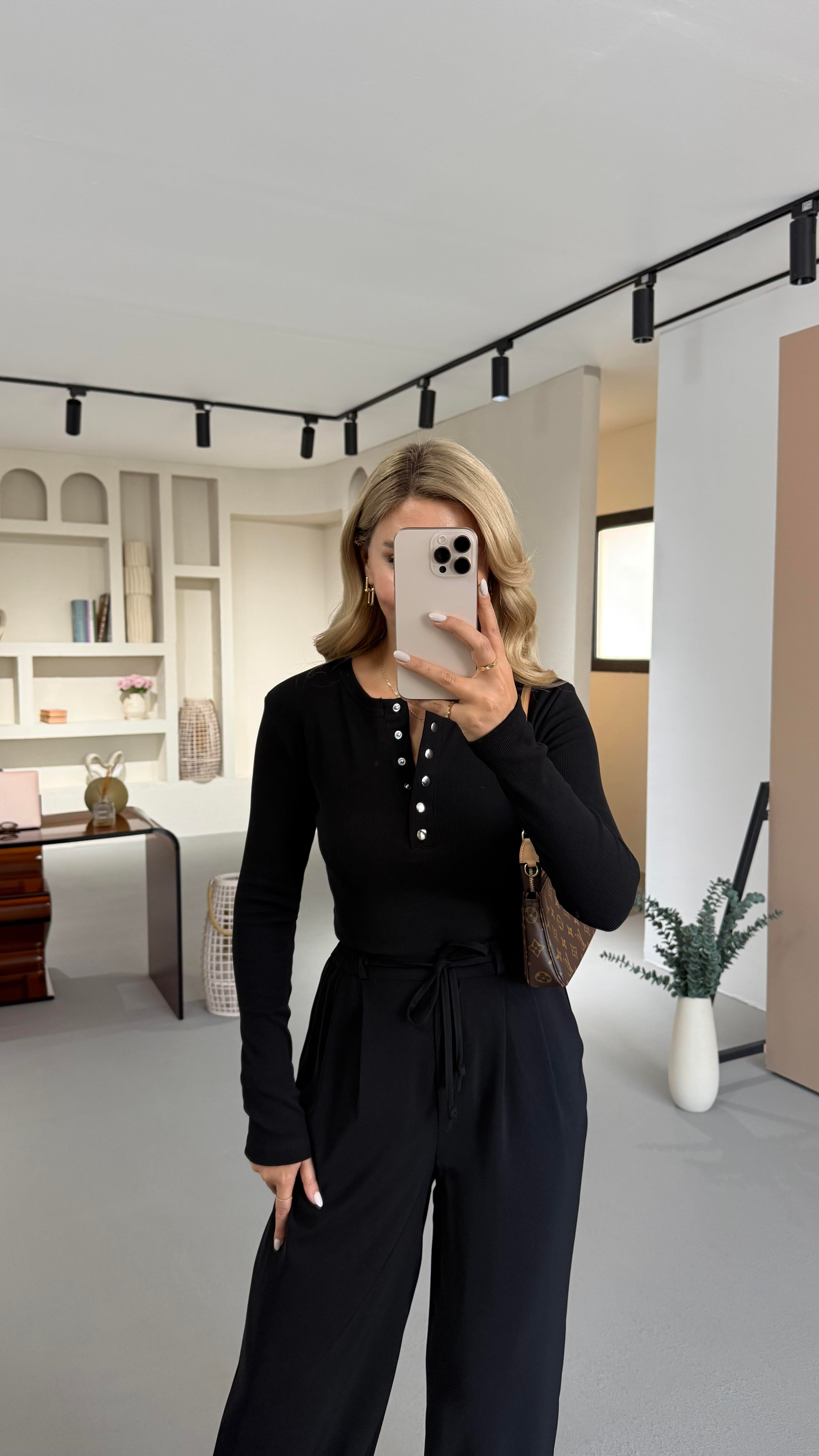 Pat Düğme Detay Fitilli Siyah Bluz (BLZ-0220-SYH)