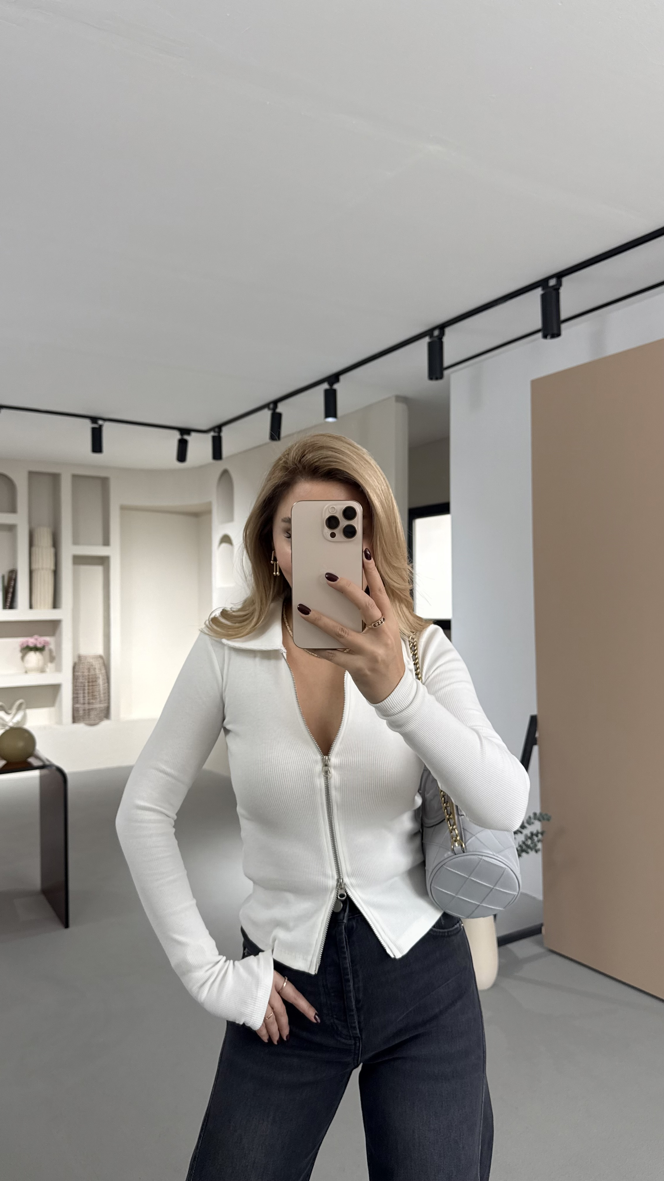 Polo Yaka Çift Fermuarlı Ekru Bluz