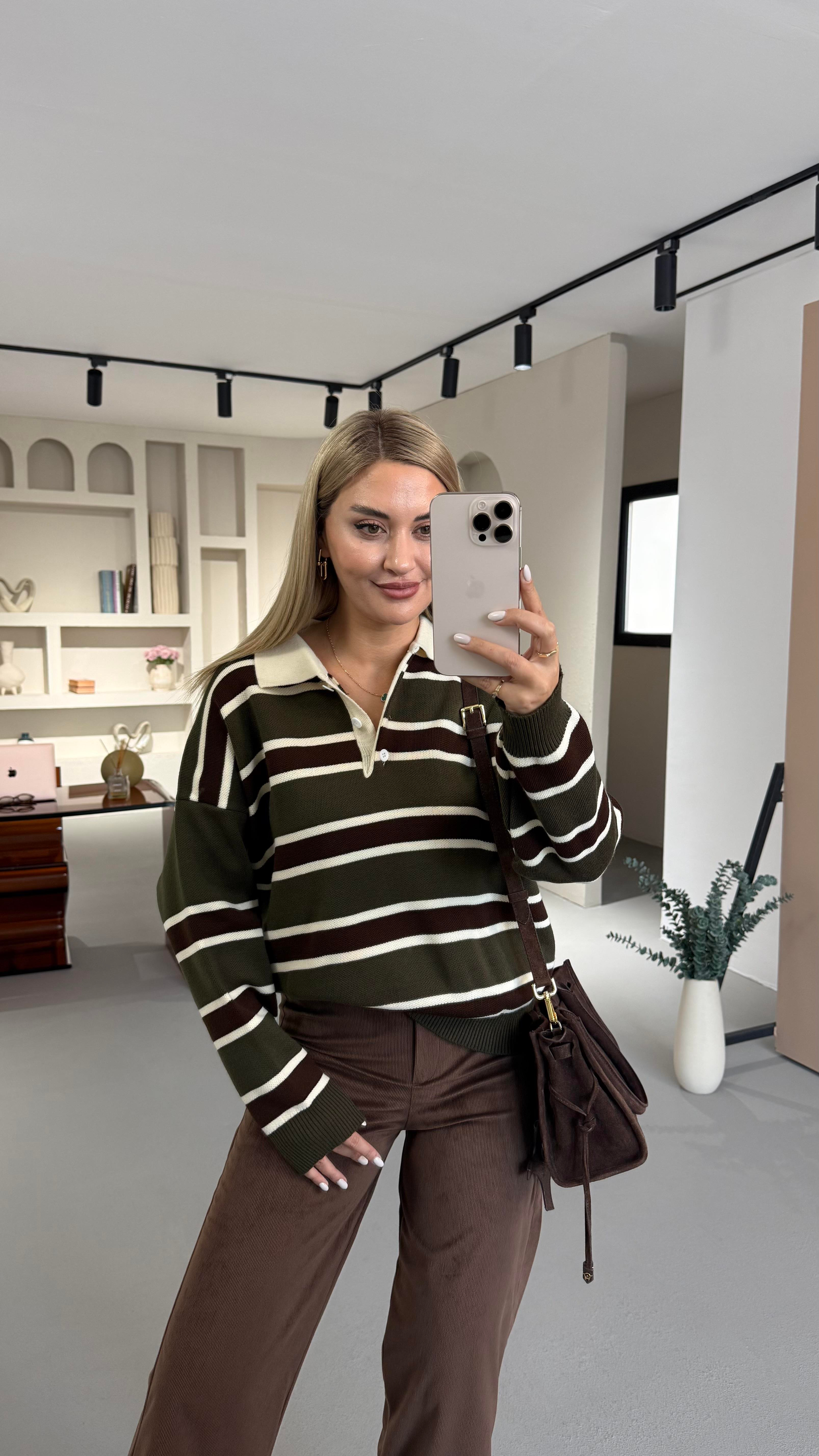 Polo Yaka Çizgili Haki Çelik Triko Kazak (KZK-0123-HAKİ)