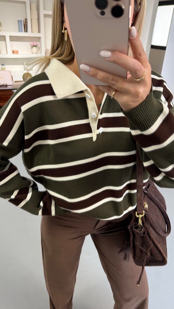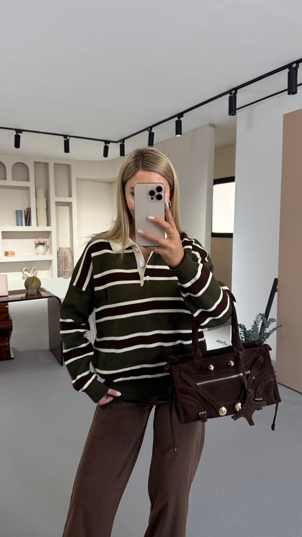 Polo Yaka Çizgili Haki Çelik Triko Kazak