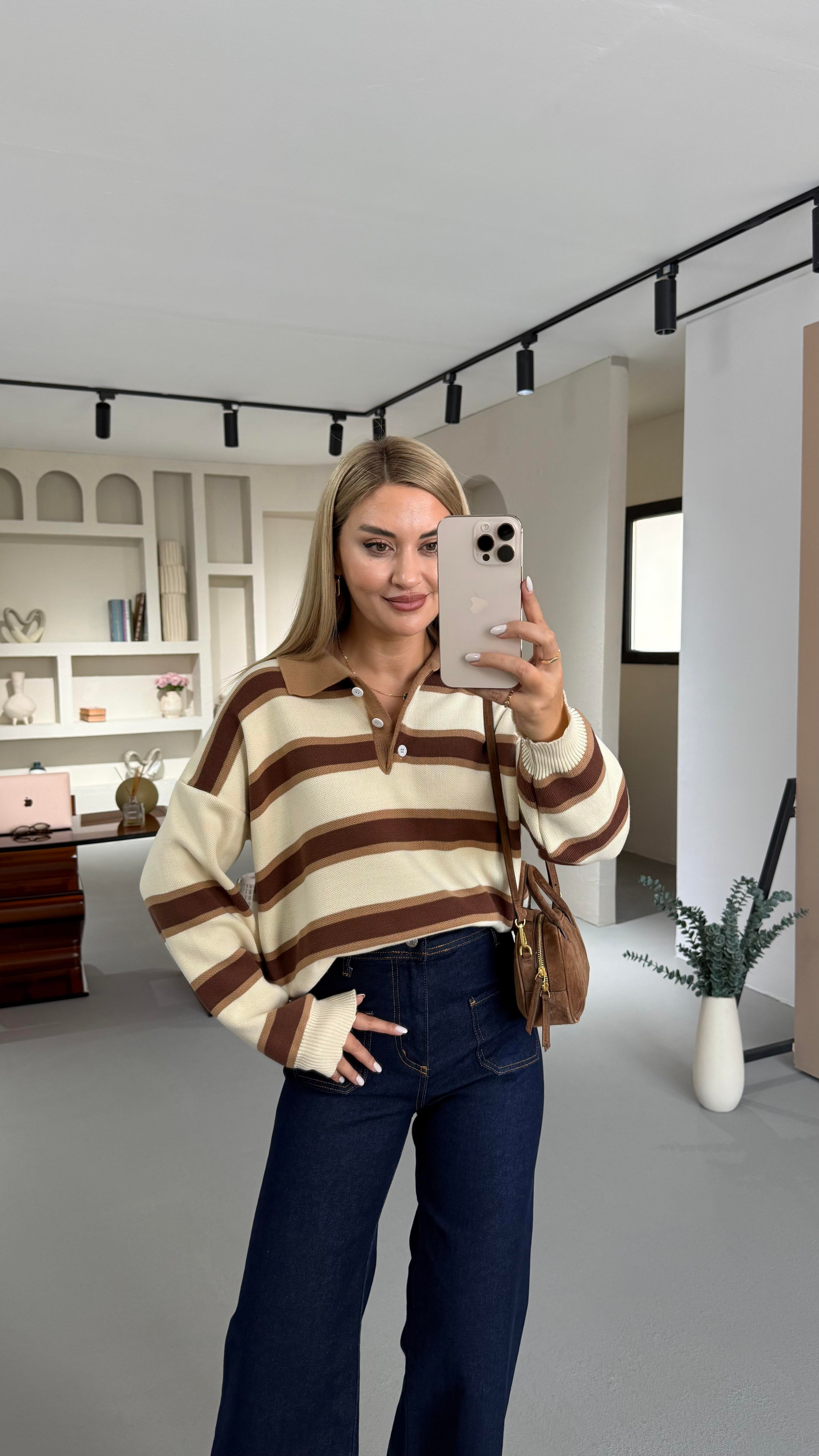 Polo Yaka Çizgili Krem Çelik Triko Kazak