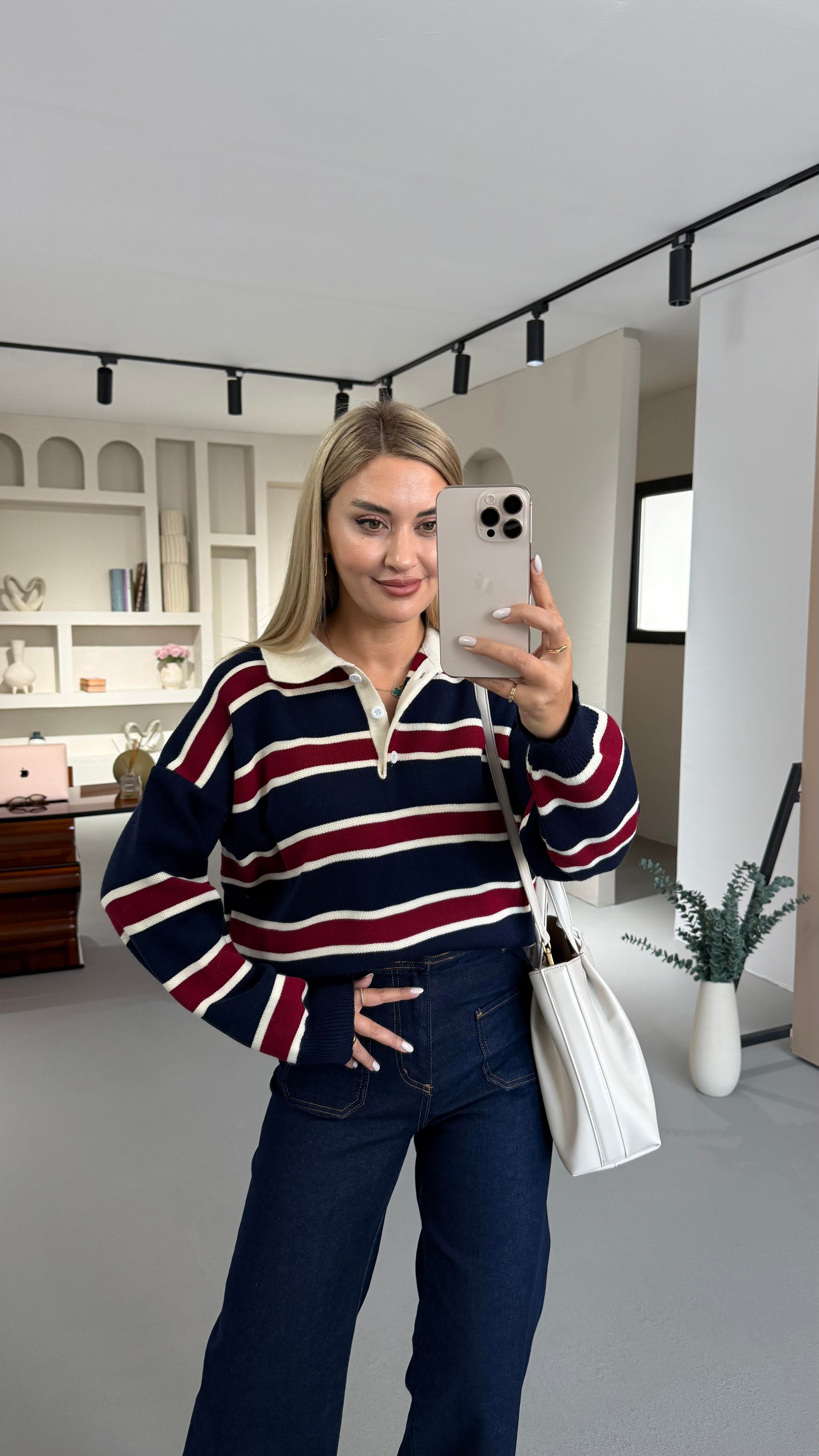 Polo Yaka Çizgili Lacivert Çelik Triko Kazak (KZK-0123-LCV)