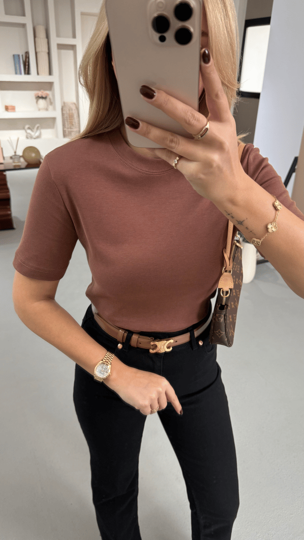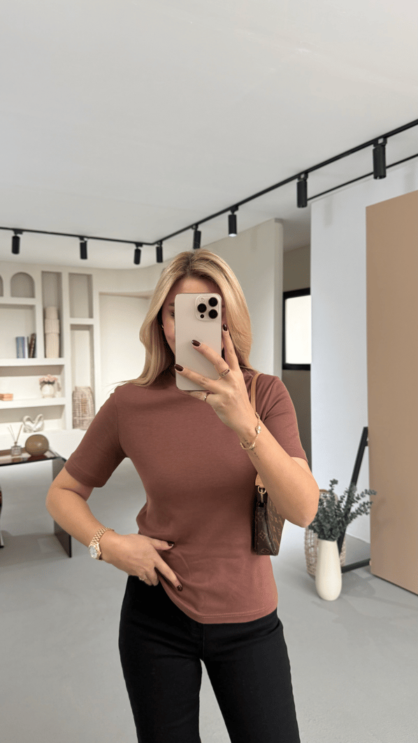 Premium Seri Bisiklet Yaka Pamuklu Bakır Kahve Basic Tshirt