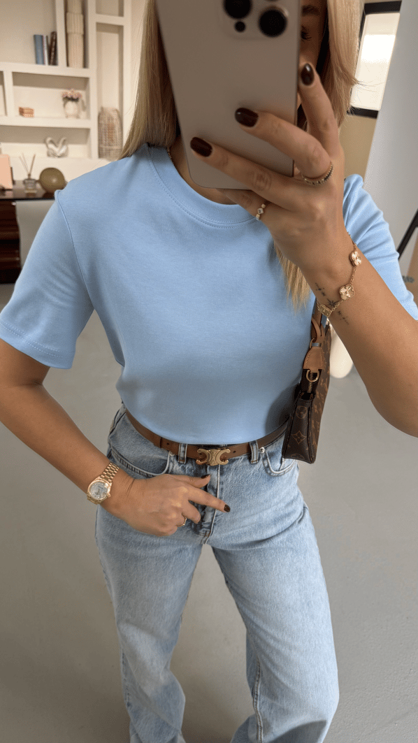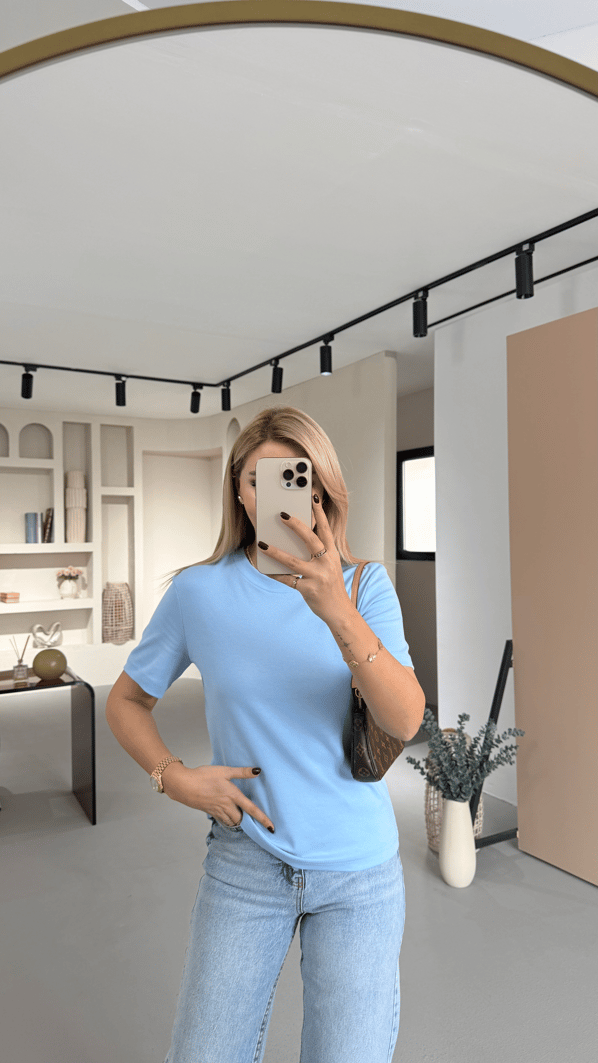 Premium Seri Bisiklet Yaka Pamuklu Bebe Mavi Basic Tshirt