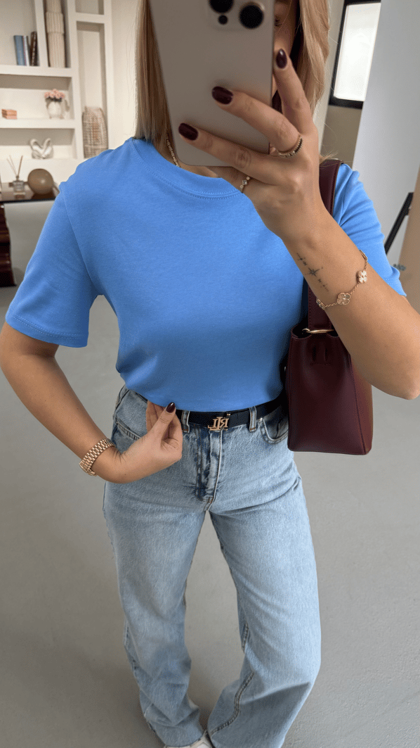 Premium Seri Bisiklet Yaka Pamuklu Mavi Basic Tshirt