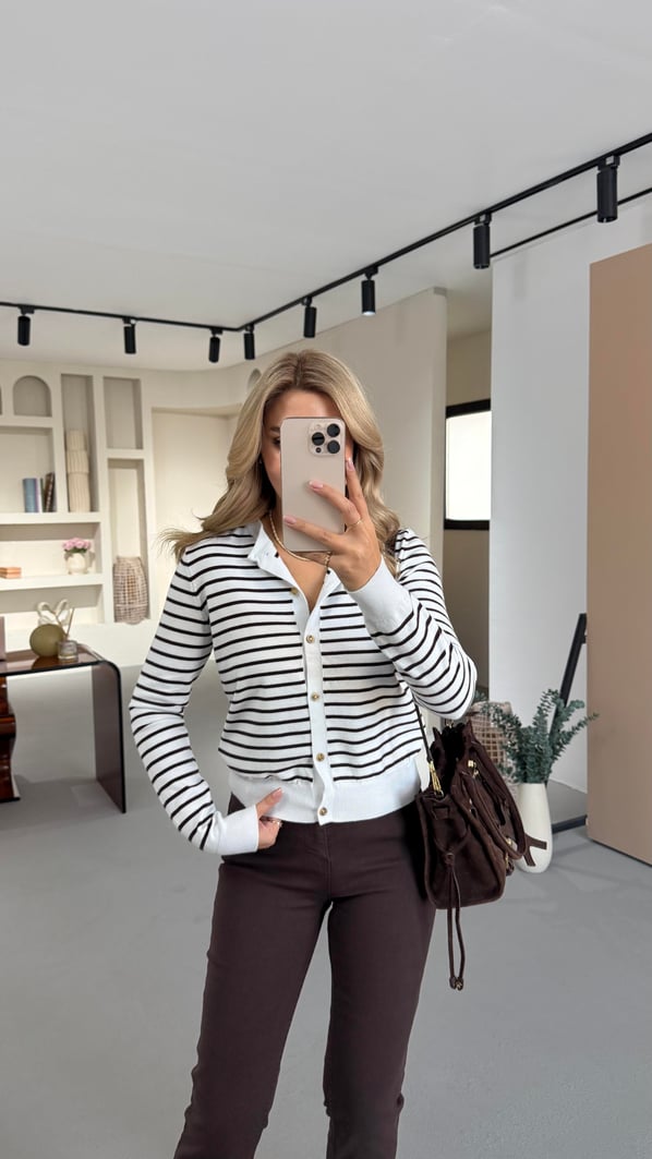 Premium Seri Kemik Düğme Detay Kahve Çizgili Yumoş Hırka