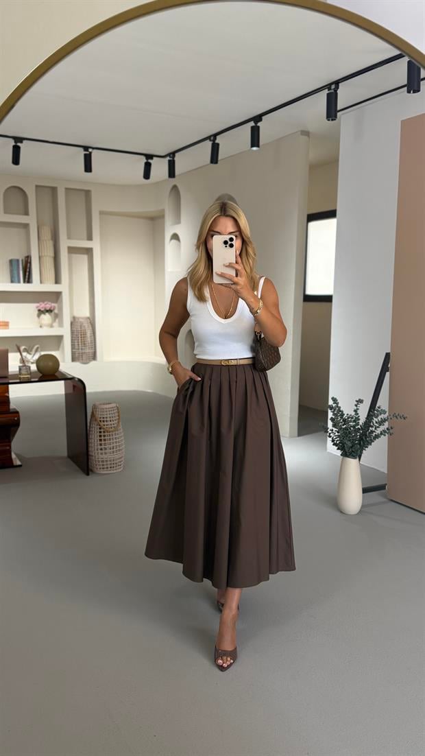 Premium Seri Piliseli Kahve Poplin Çan Etek (ETK-0251-KHV)
