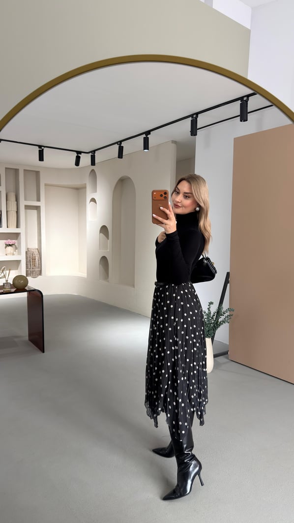 Puantiyeli Asimetrik Siyah Şifon Etek