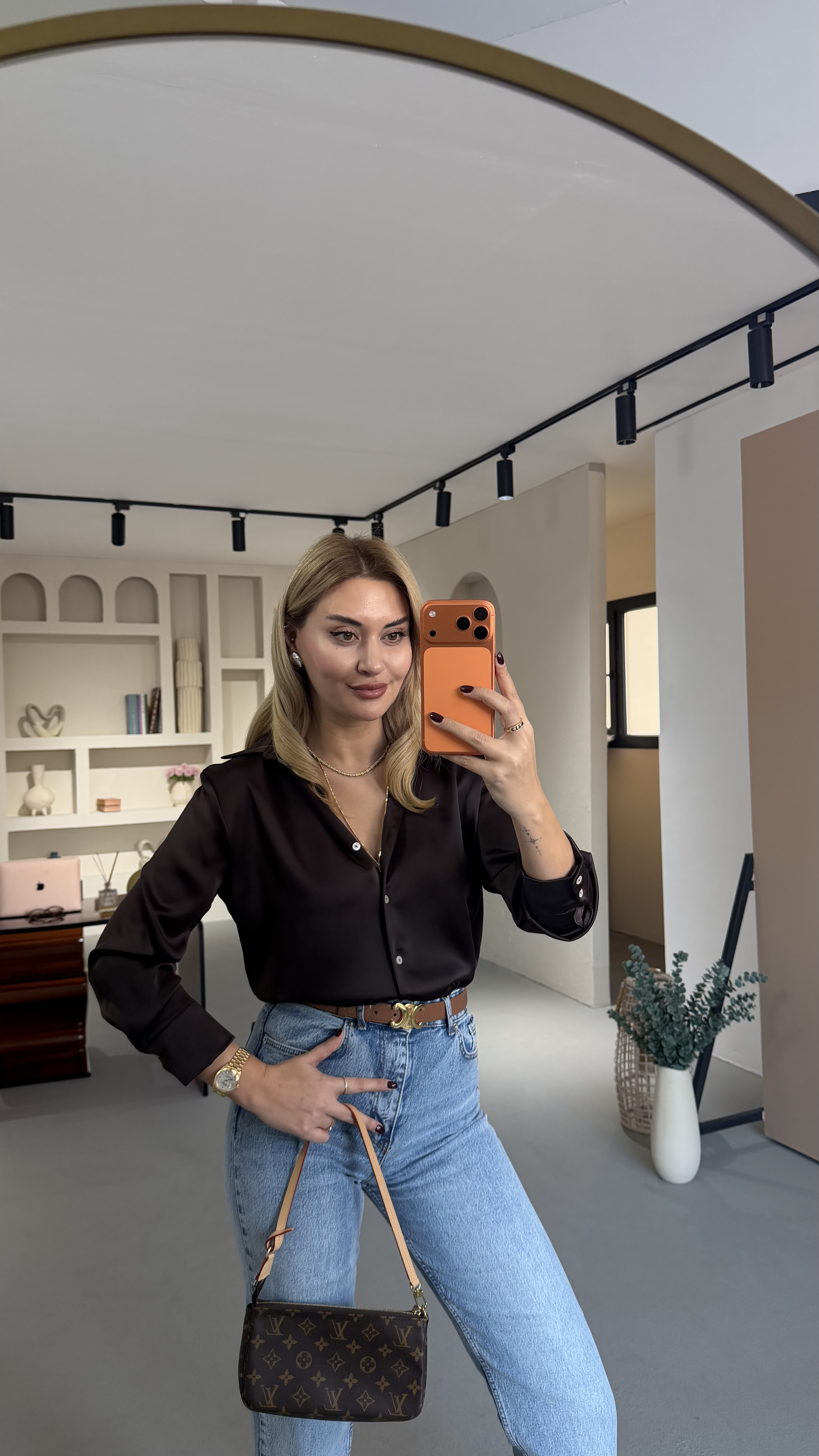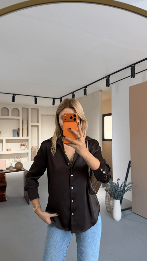 Sedef Düğmeli Kahve Saten Gömlek
