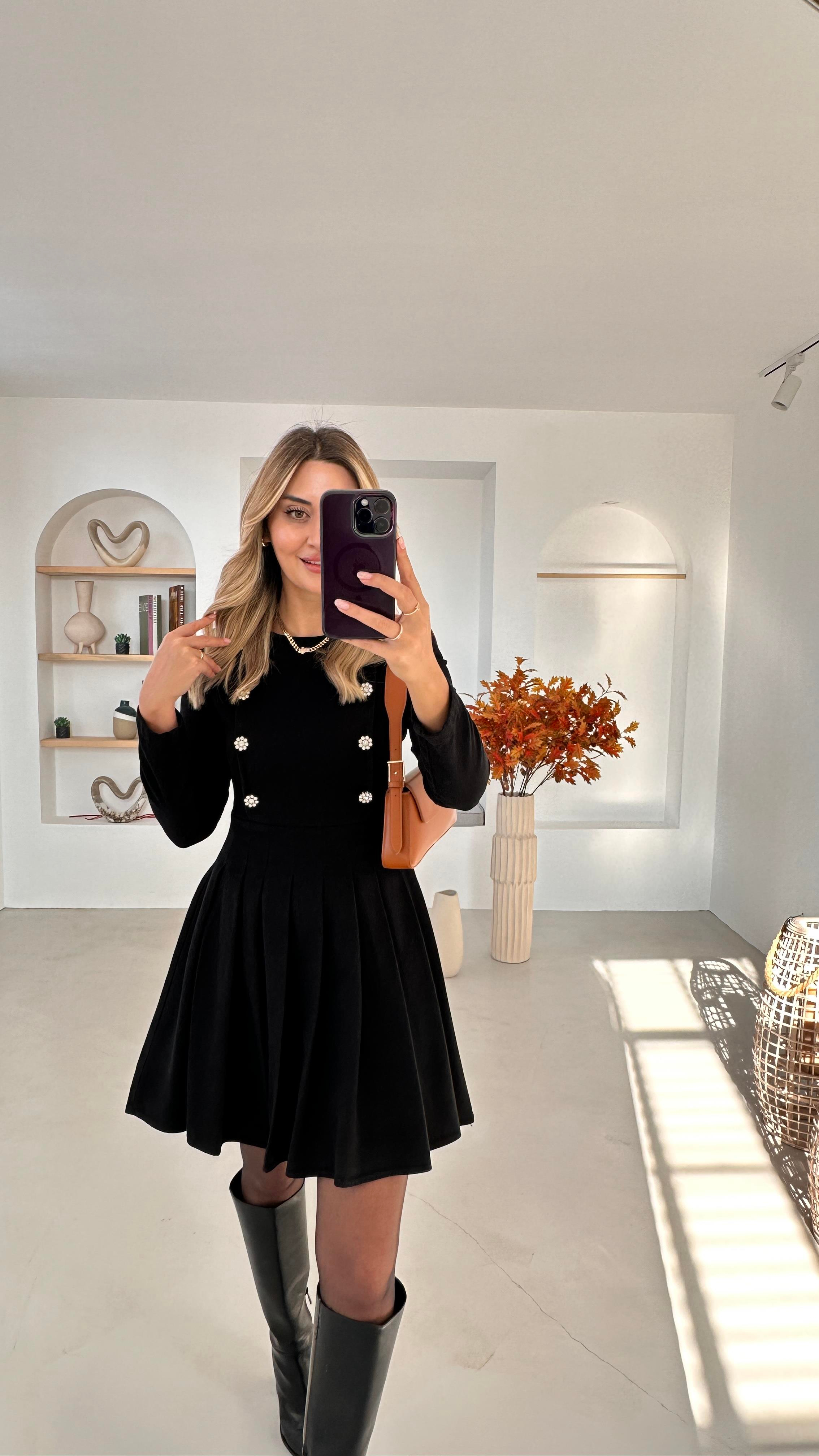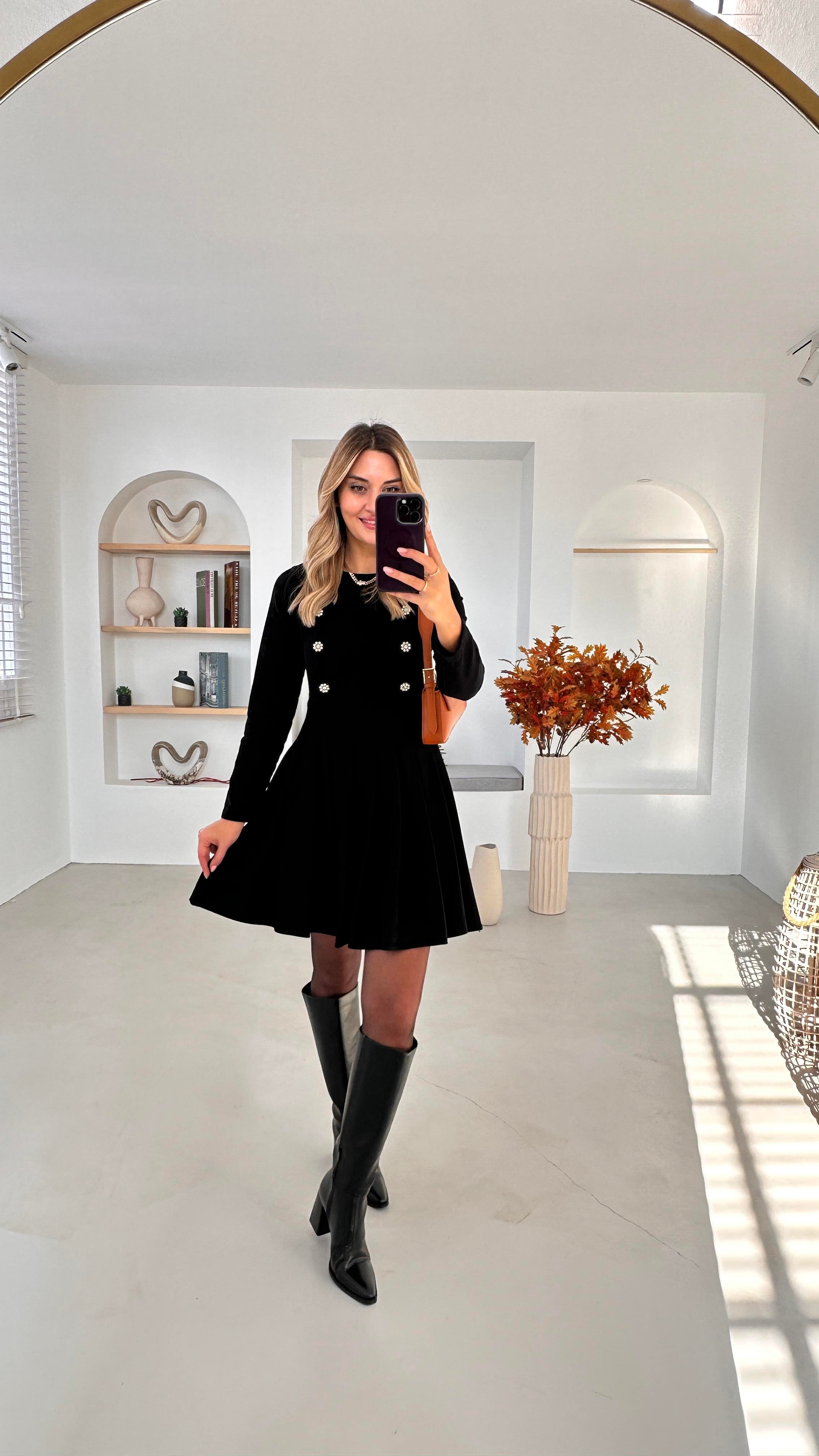 Taş Düğme Detay Piliseli Siyah Denim Elbise