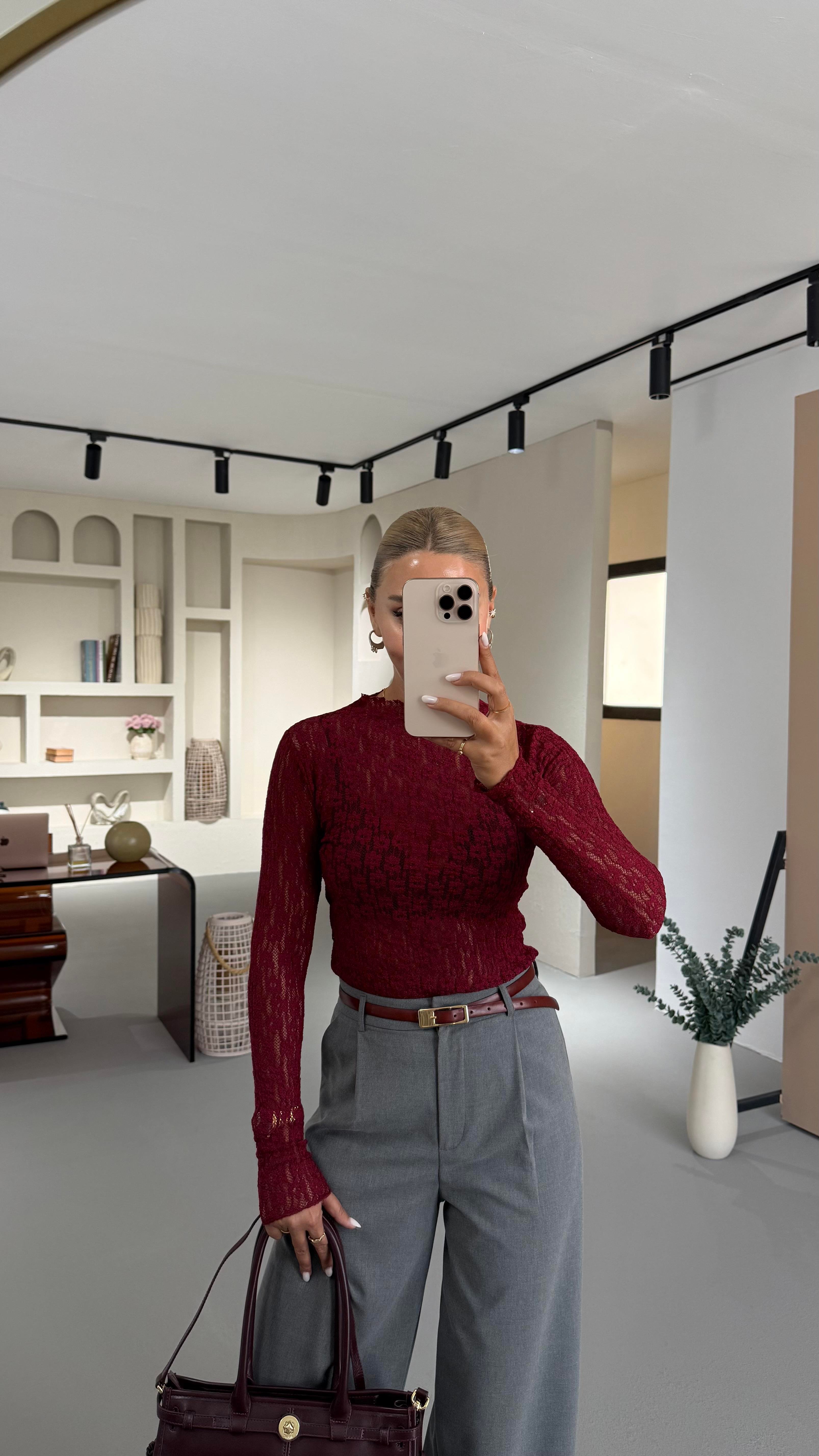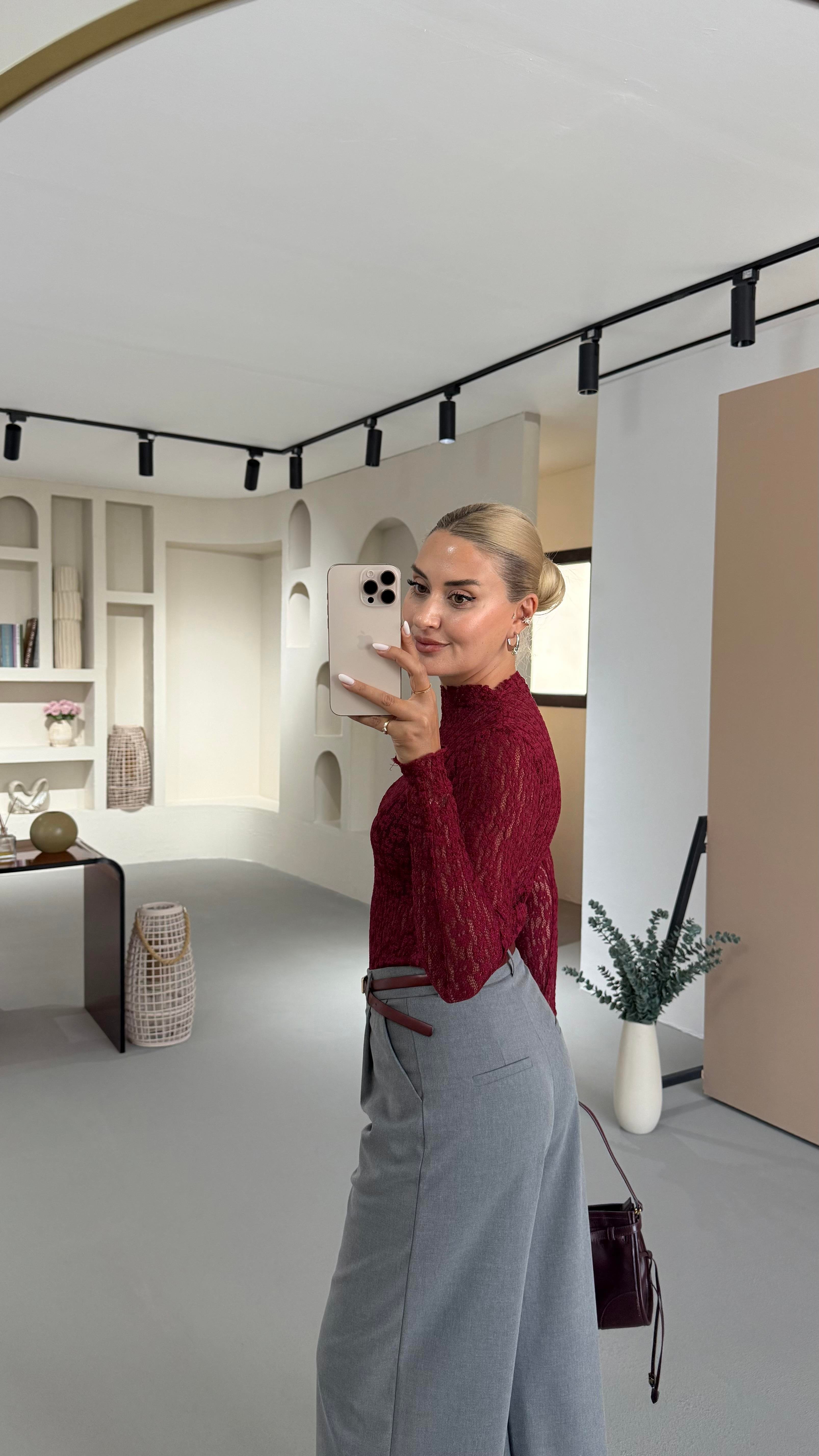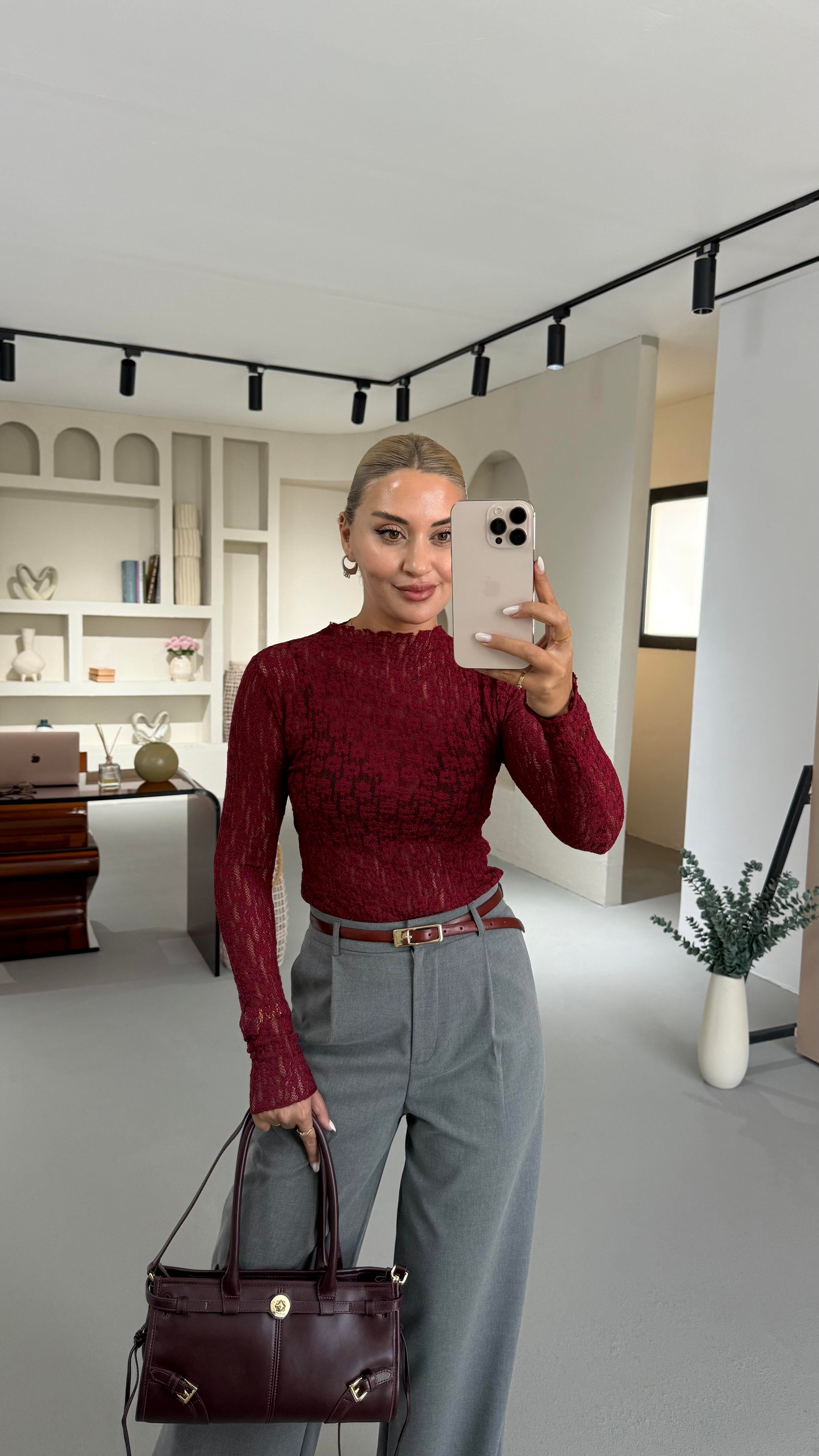 Transparan Bordo Dantel Bluz
