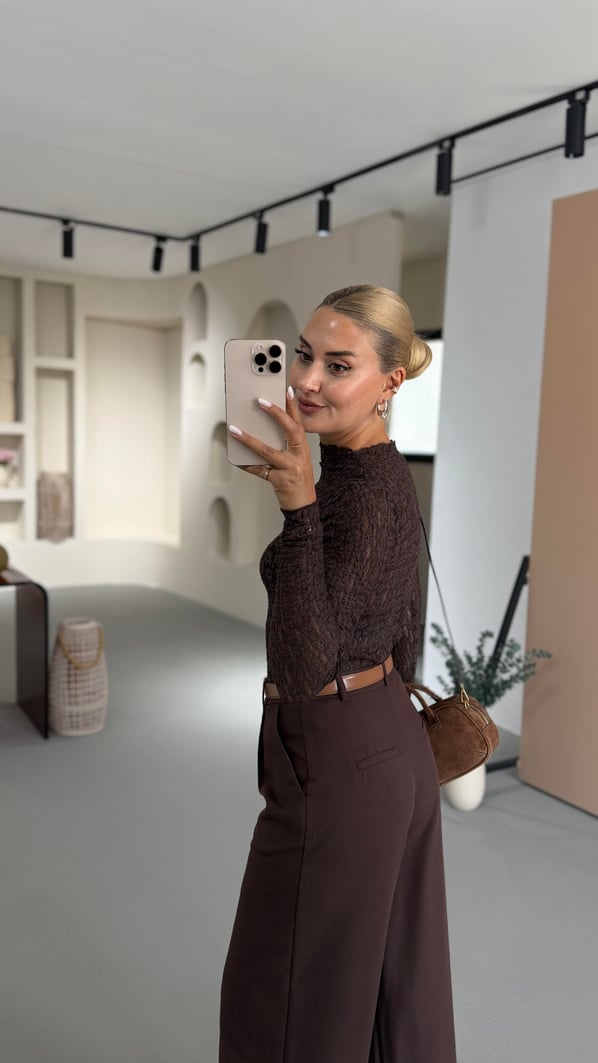Transparan Kahve Dantel Bluz