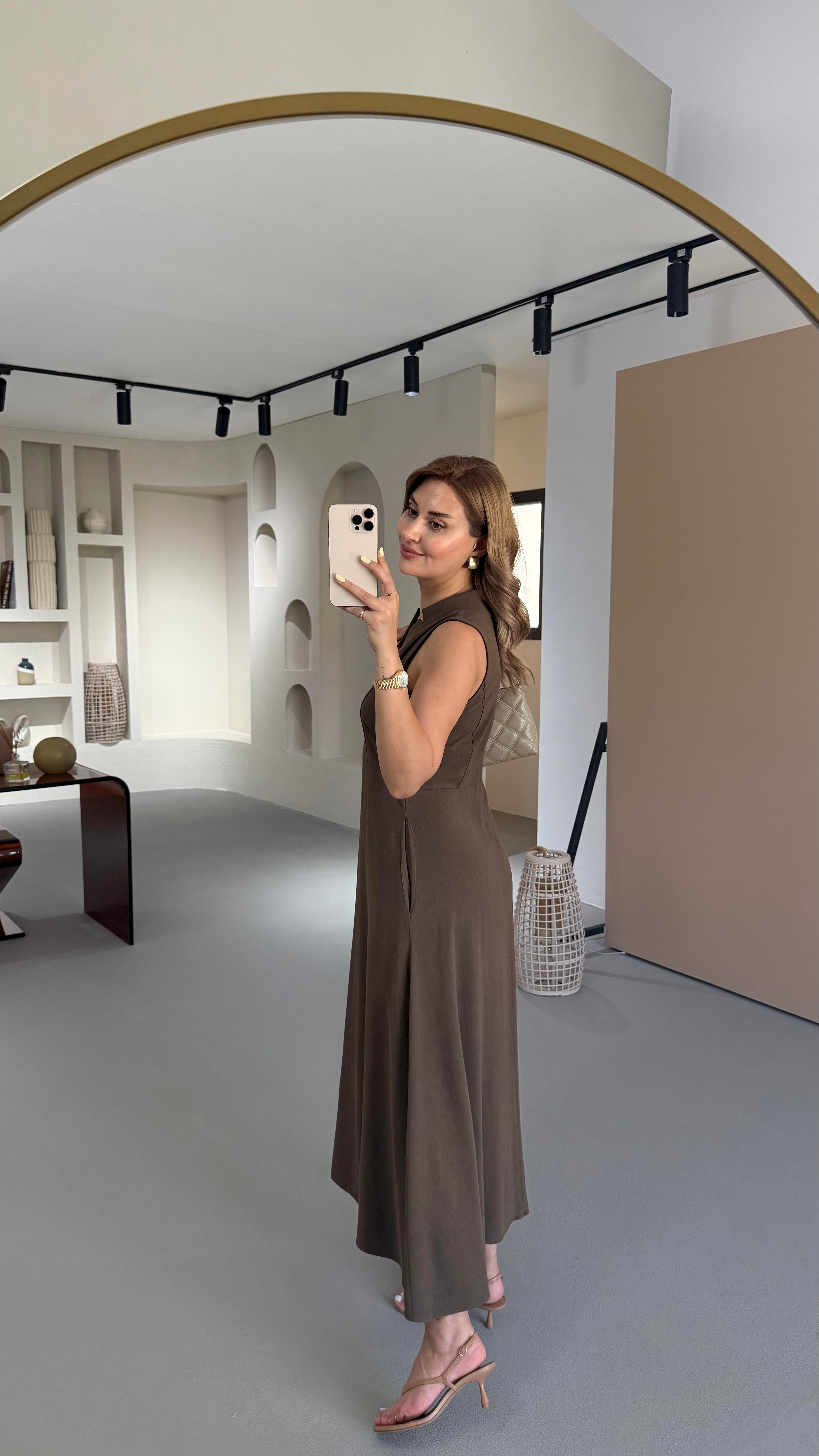 V Yaka Cep Detay Kahve Keten Elbise (ELB-0688-KHV)