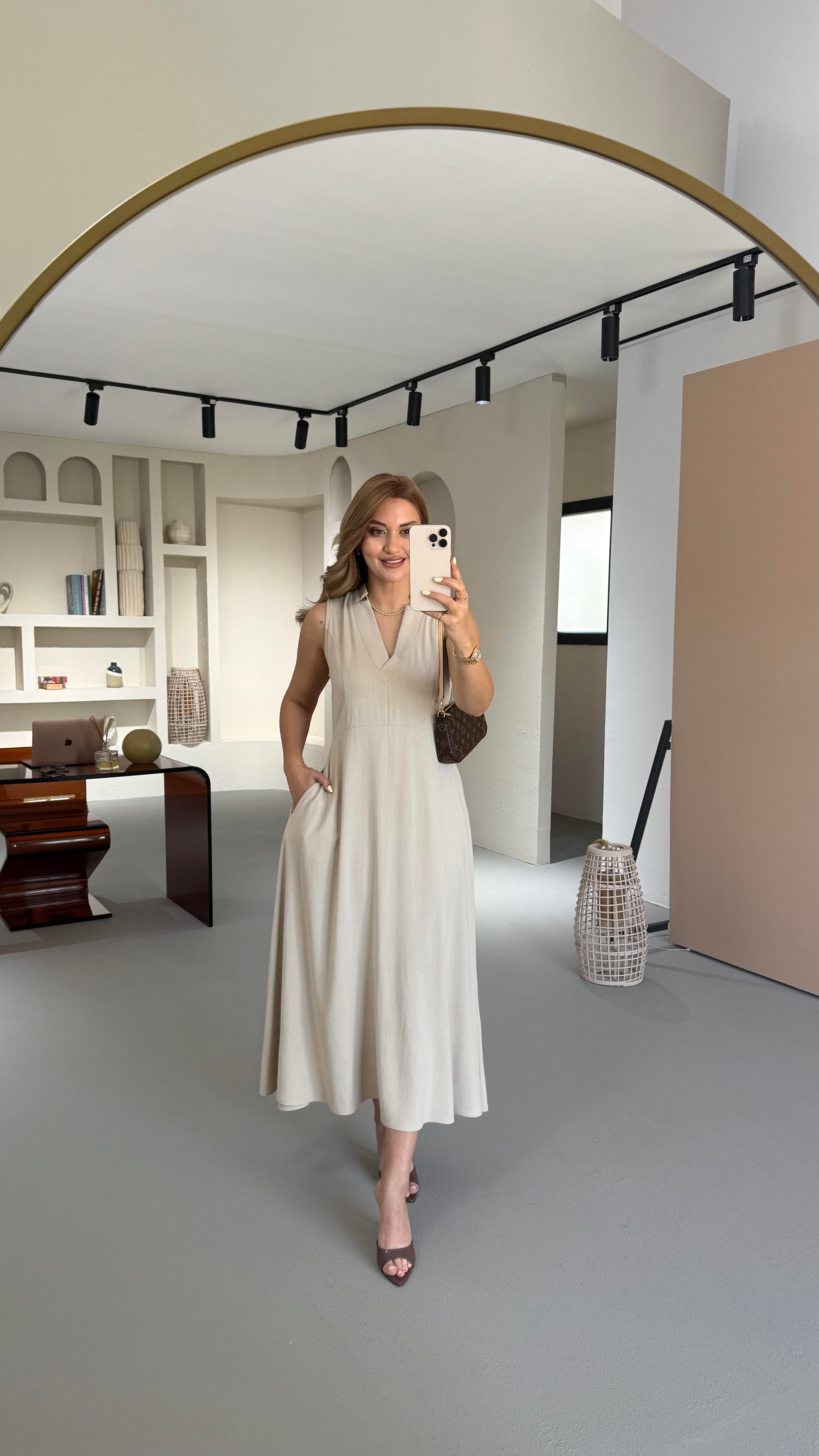 V Yaka Cep Detay Taş Keten Elbise (ELB-0688-TAŞ)
