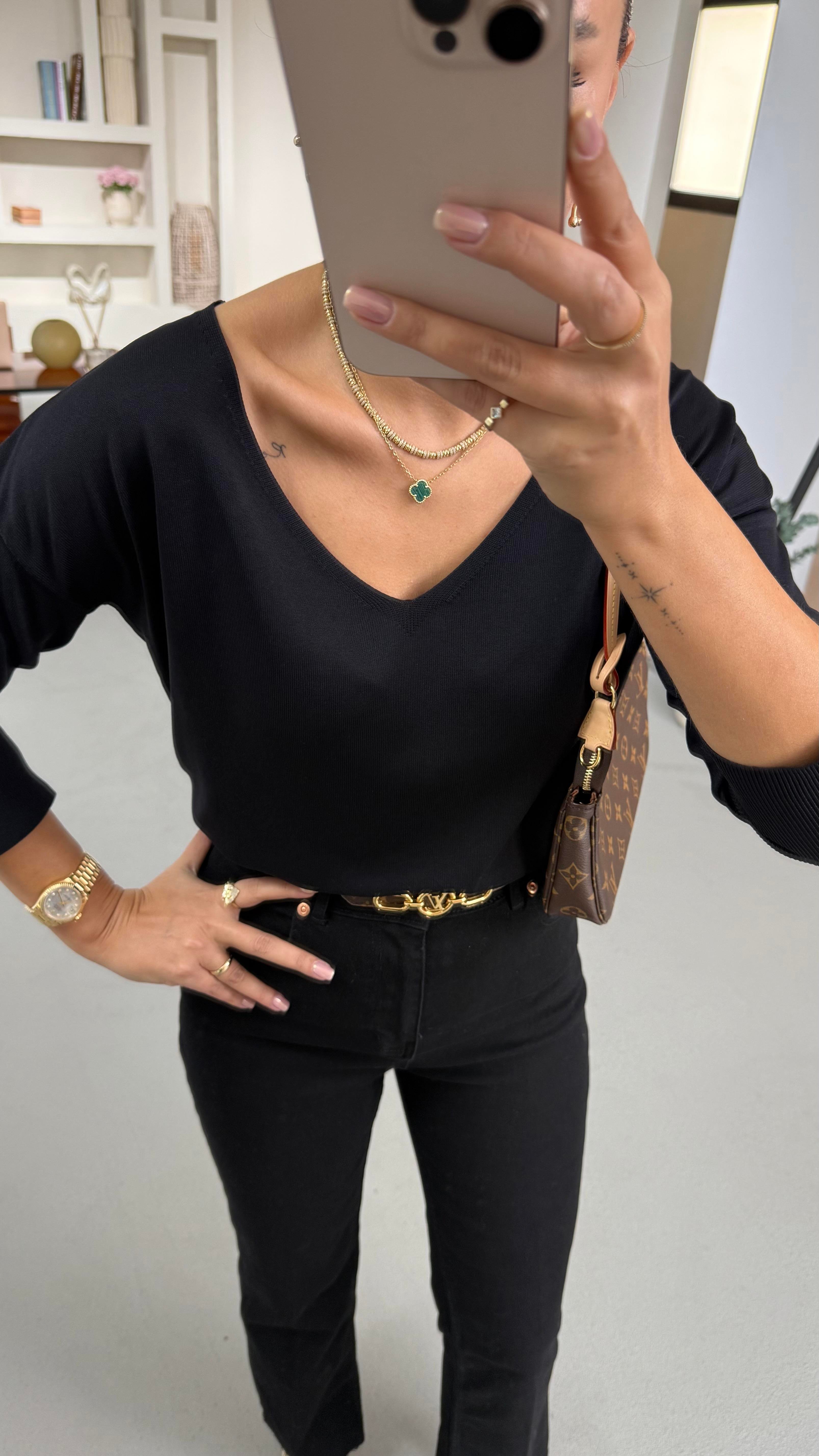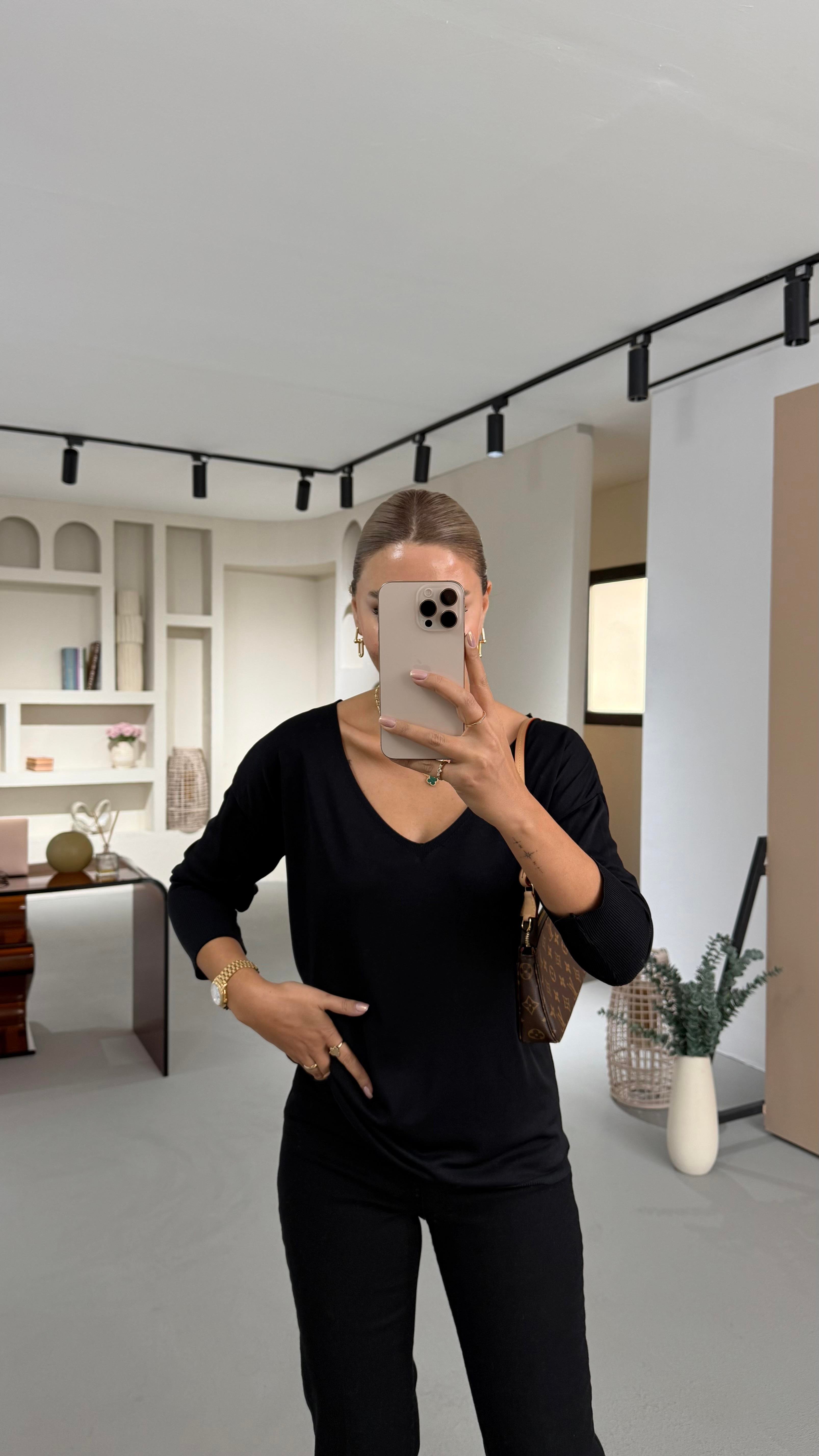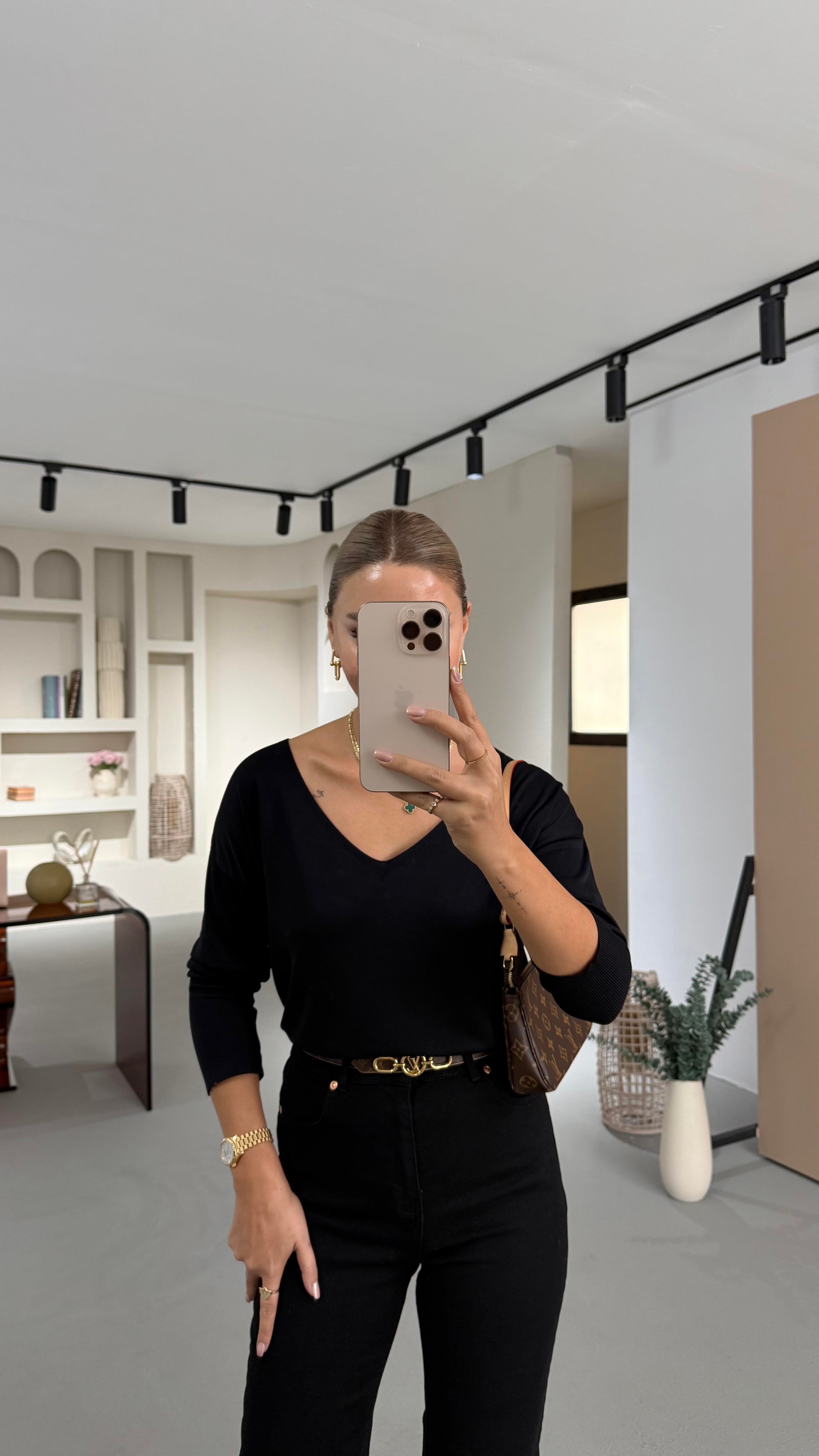 V Yaka Dökümlü Siyah Triko Bluz (BLZ-0223-SYH)