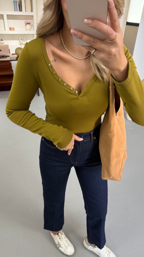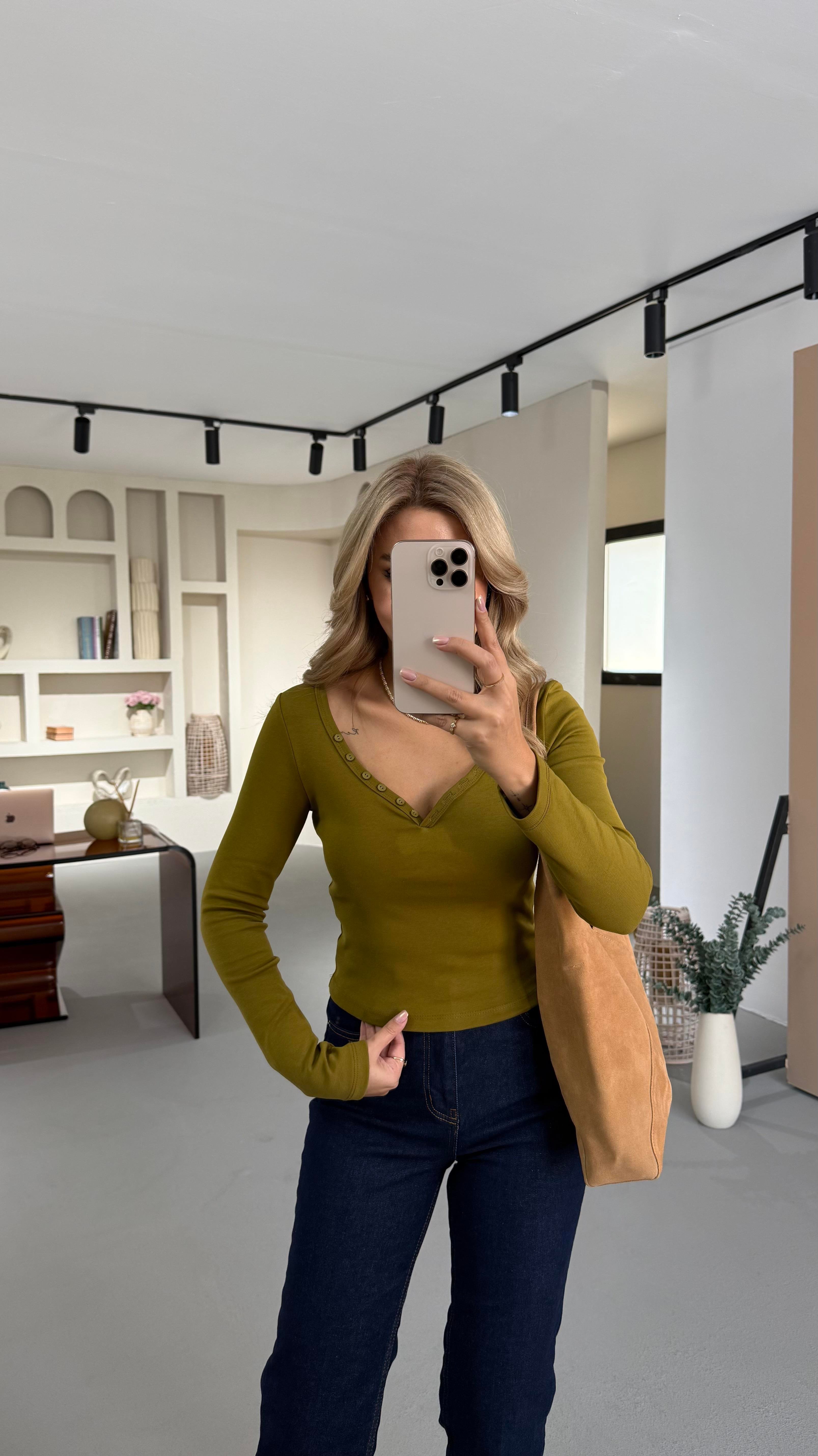V Yaka Düğme Detay Olive Bluz (BLZ-0221-OLV)