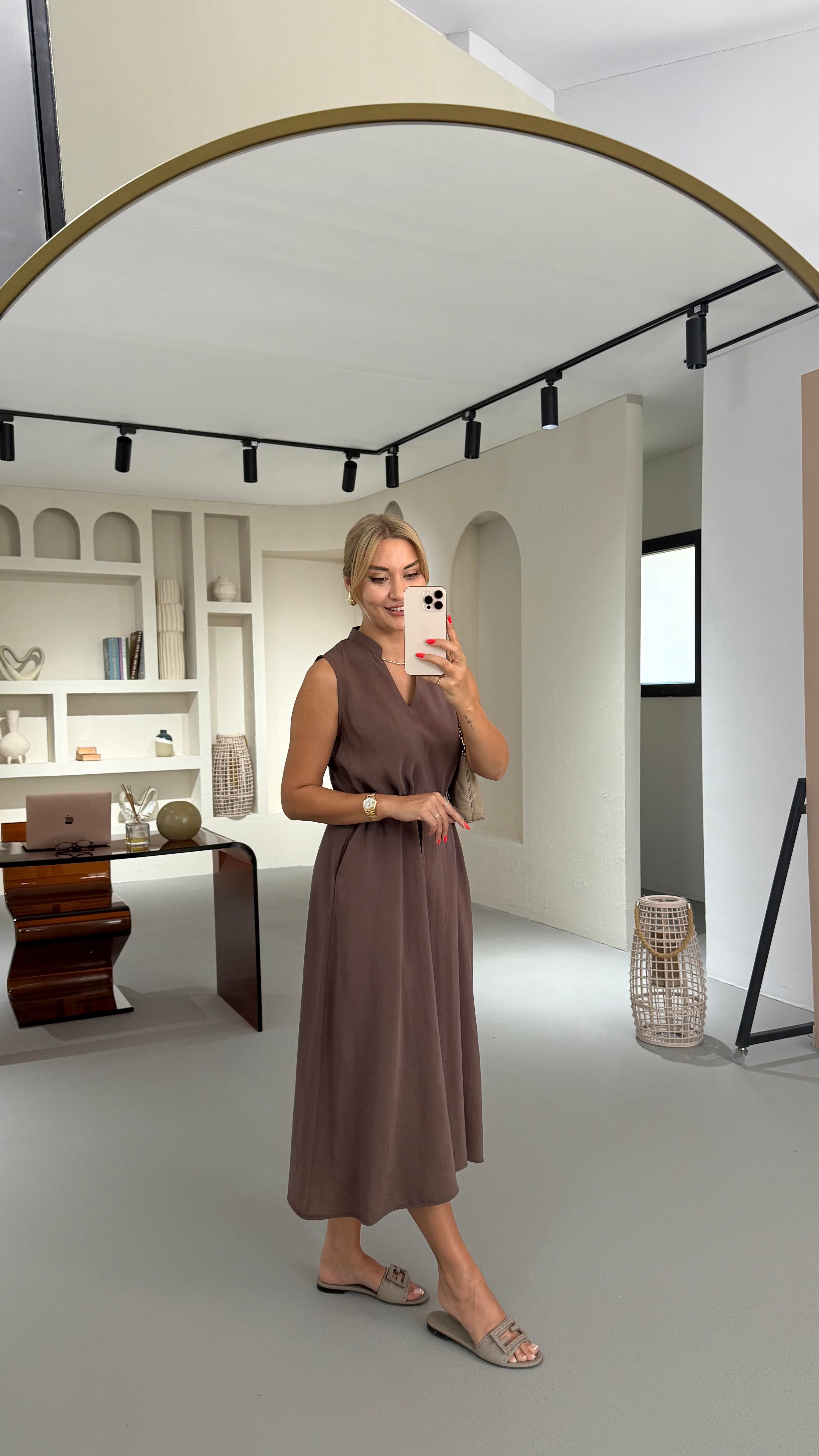 V Yaka Kahve Tensel Modal Elbise (ELB-0727-KHV)
