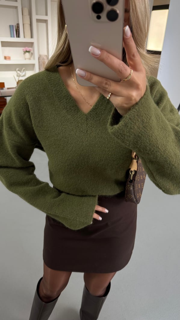 V Yaka Oversize Yosun Yeşili Yumoş Kazak