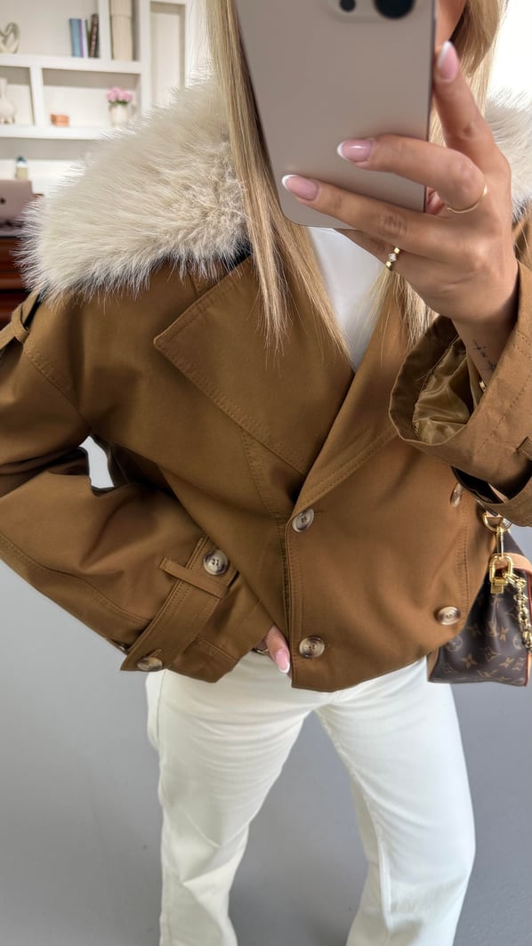 Yaka Kürklü Kemik Düğme Detay Kahve Trenç