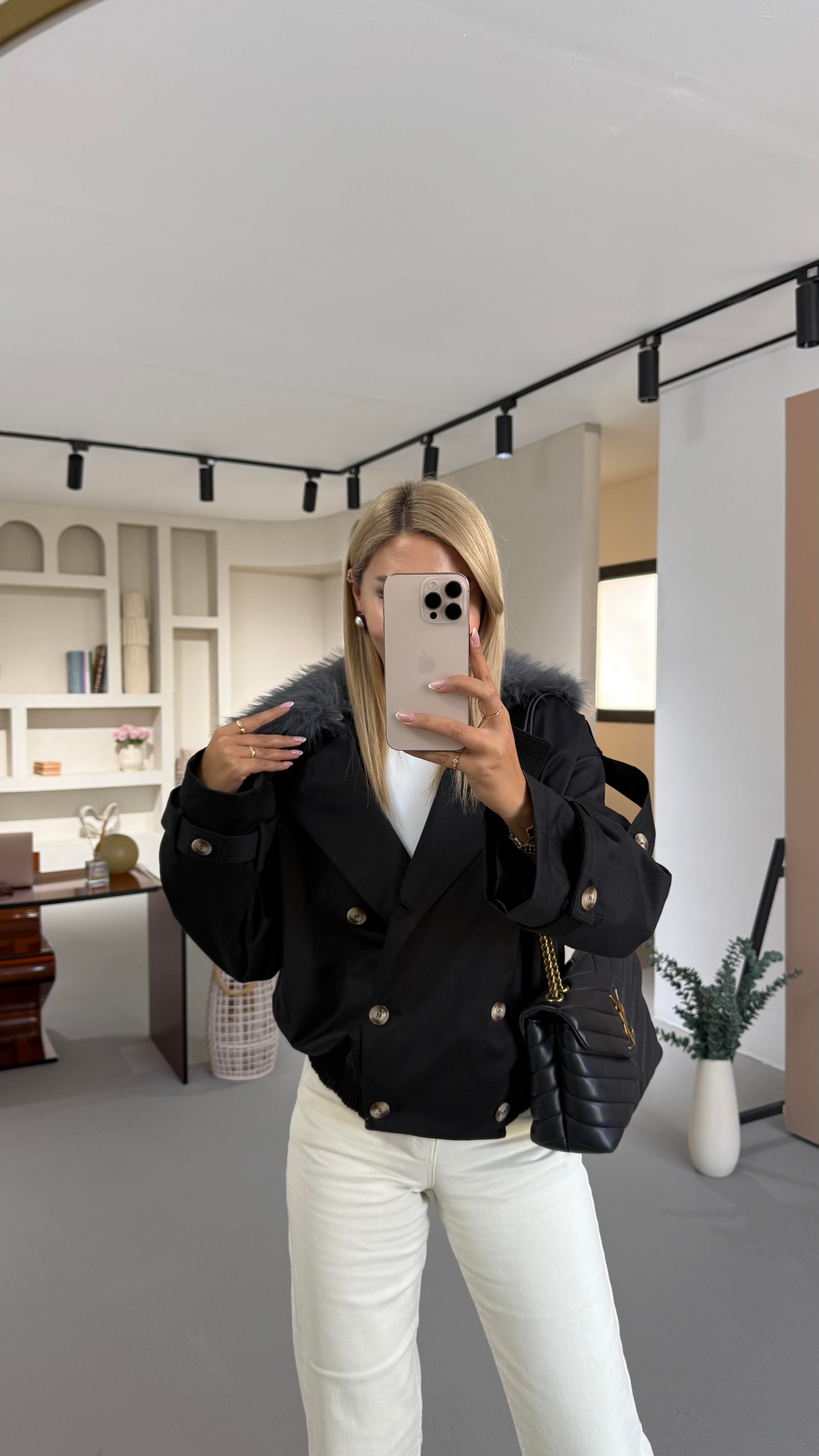 Yaka Kürklü Kemik Düğme Detay Siyah Trenç
